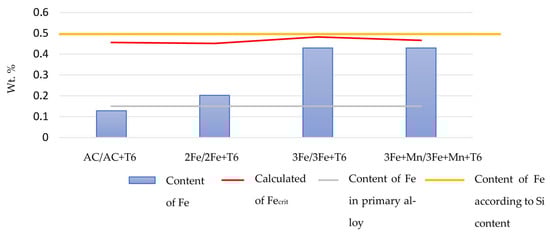 The calculation of Fecrit according to Equation (1) (Figure 5) shows that each experimental material has a content of Fe lower than the calculated value of Fecrit. The same results are observed according to the content of Si in Al-Si alloys [] calculation (Figure 5, Table 2).