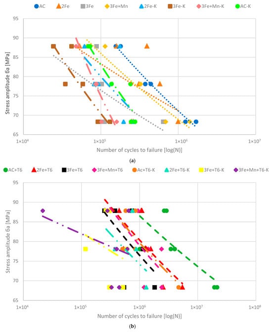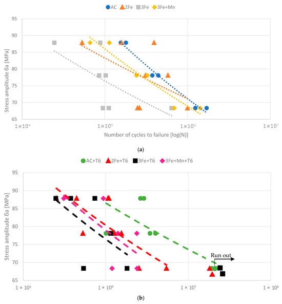 The Wöhler curves of the fatigue life of experimental alloys (a) without T6, and (b) with T6 condition.