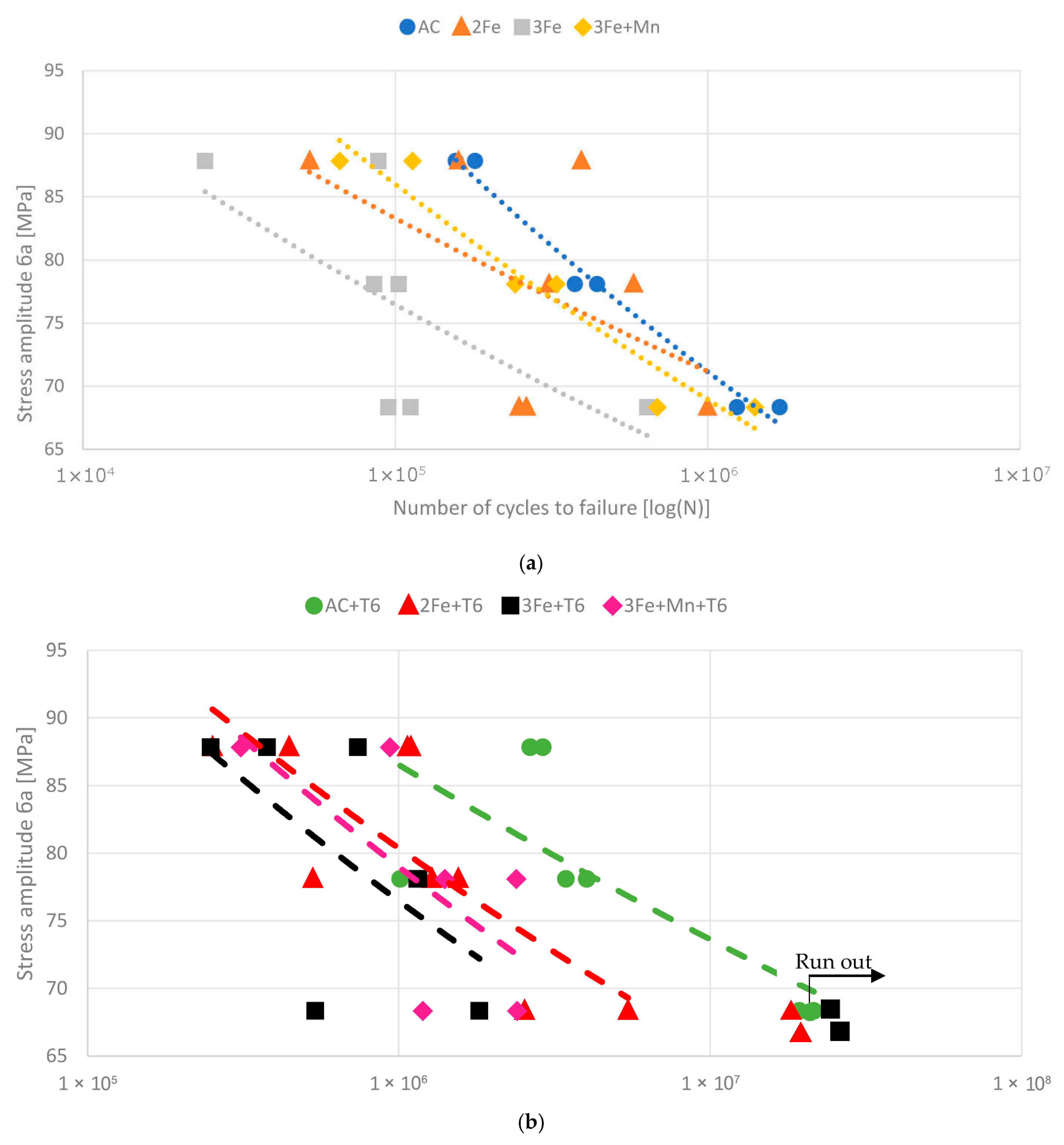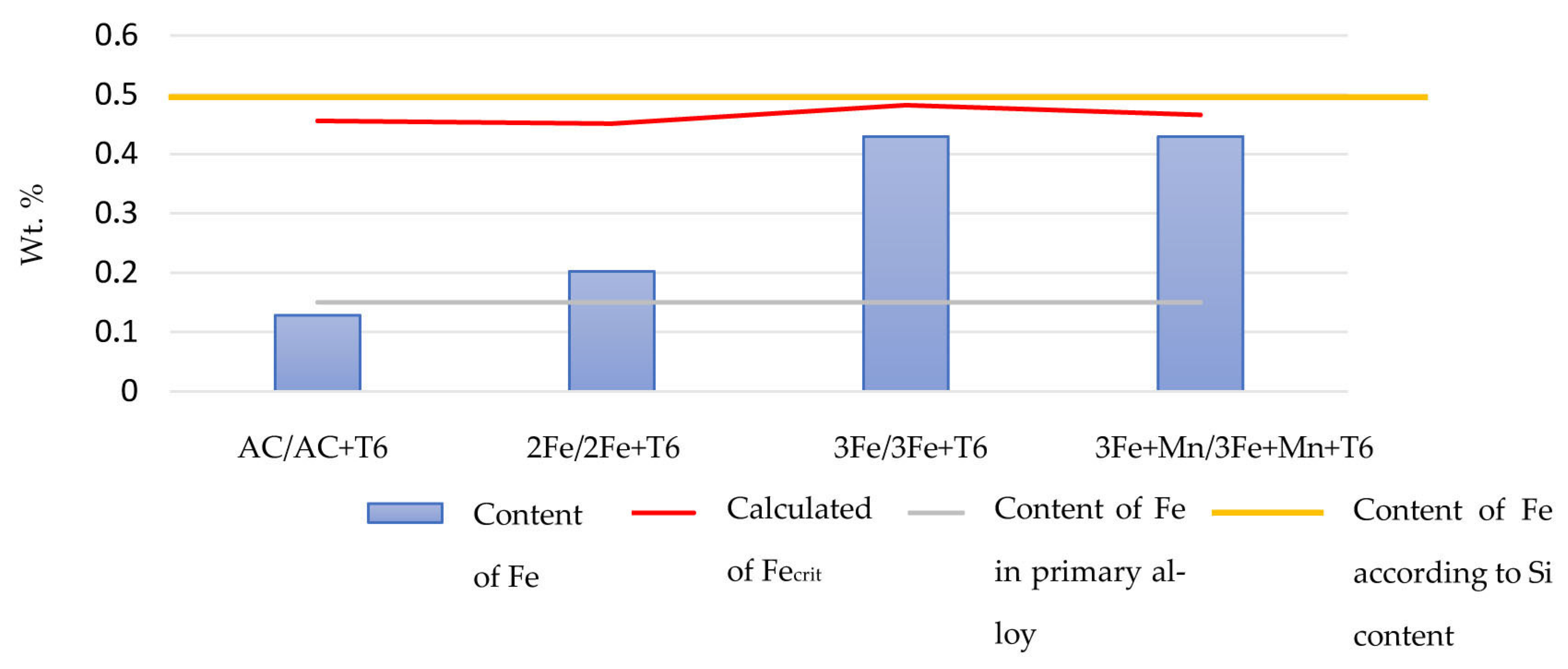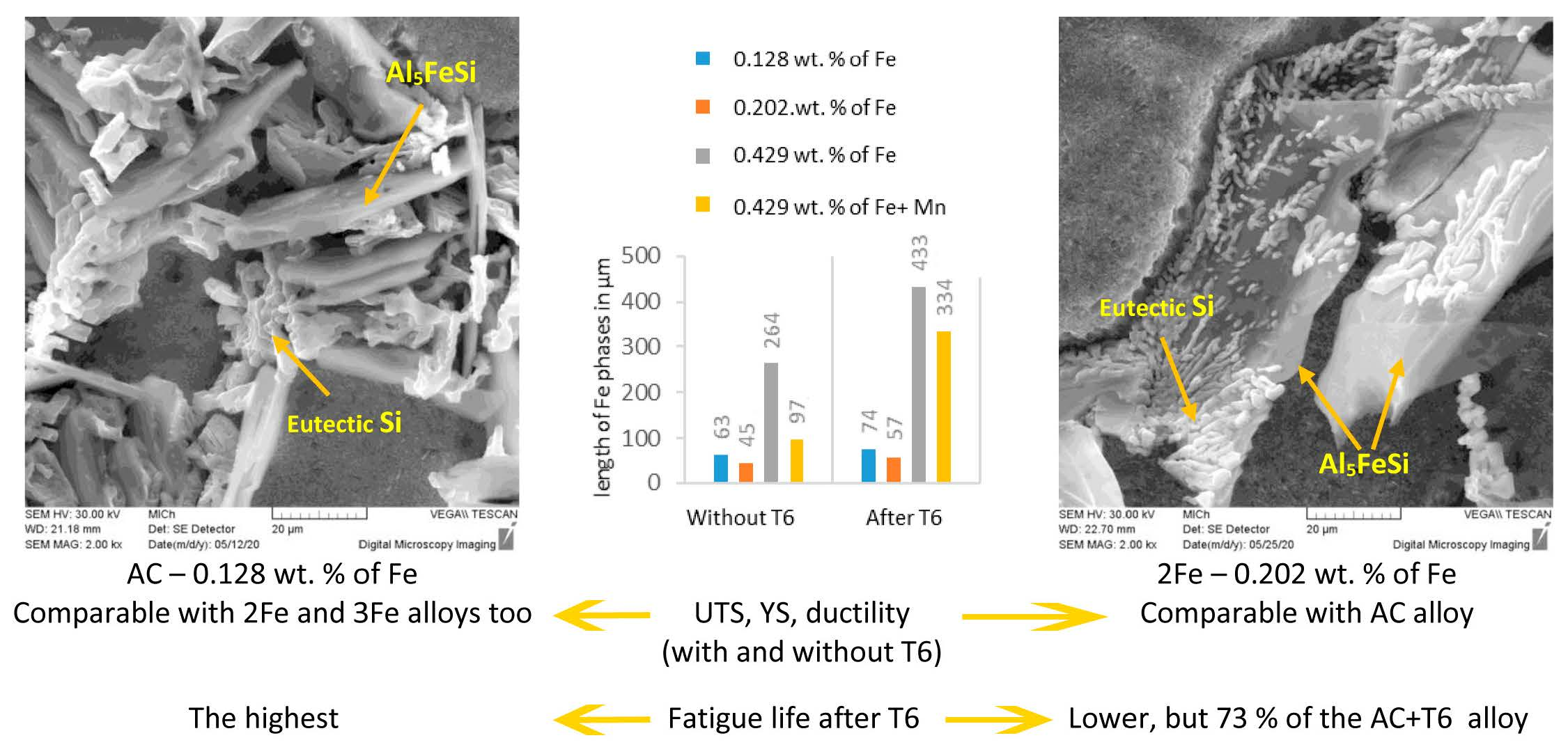 - Kuchariková, L.; Medvecká, D.; Tillová, E.; Belan, J.; Kritikos, M.; Chalupová, M.; Uhríčik, M. The effect of the β-Al5FeSi phases on microstructure, mechanical, and fatigue properties in A356.0 cast alloys with higher Fe content without additional alloying of Mn. Materials 2021, 14, 1943. [Google Scholar] [CrossRef] [PubMed]