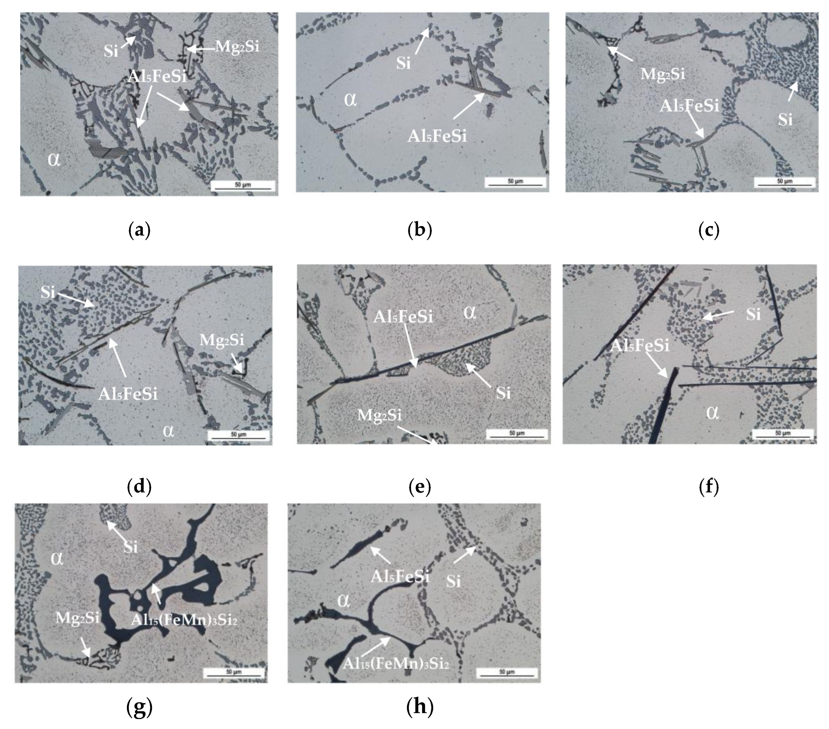 - Belmares-Perales, S.; Castro-Román, M.; Herrera-Trejo, M.; Ramírez-Vidaurri, L.E. Effect of cooling rate and Fe/Mn weight ratio on volume fractions of α-AlFeSi and β-AlFeSi phases in Al7.3Si3.5Cu alloy. Met. Mater. Int. 2008, 14, 307–314. [Google Scholar] [CrossRef]
