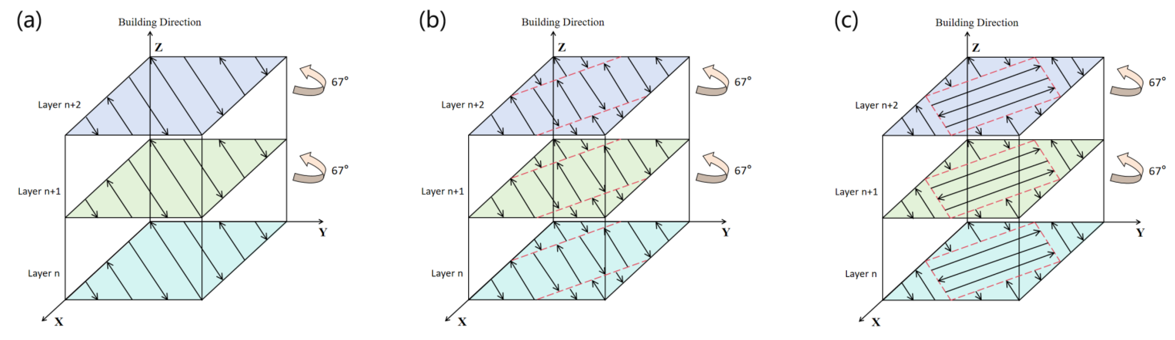 - Chang, S.J.; Wei, Z.X. Influences of the scanning strategy on surface roughness in selective laser melting. Proc. Inst. Mech. Eng. Part B J. Eng. Manuf. 2020, 236, 14. [Google Scholar] [CrossRef]