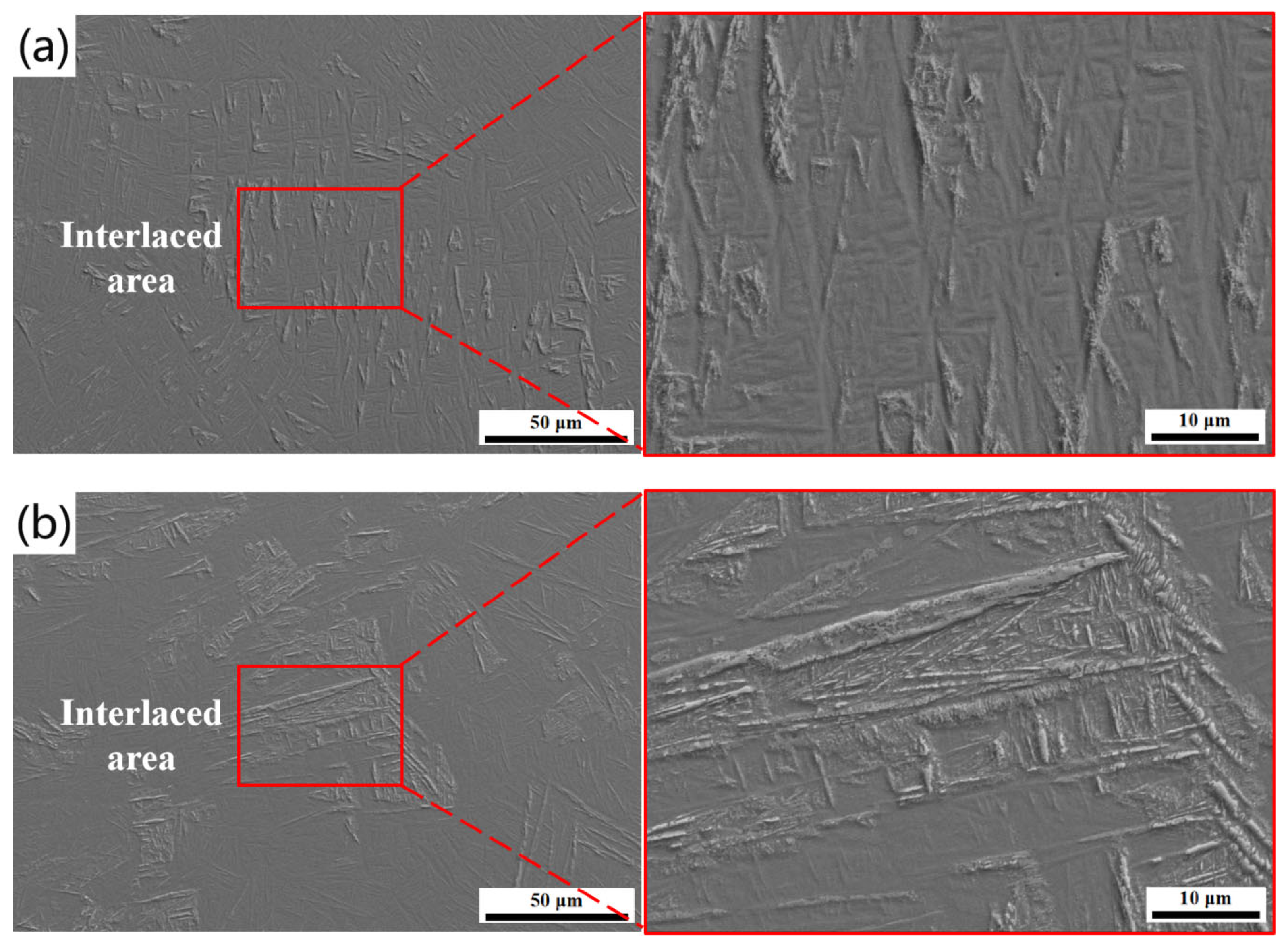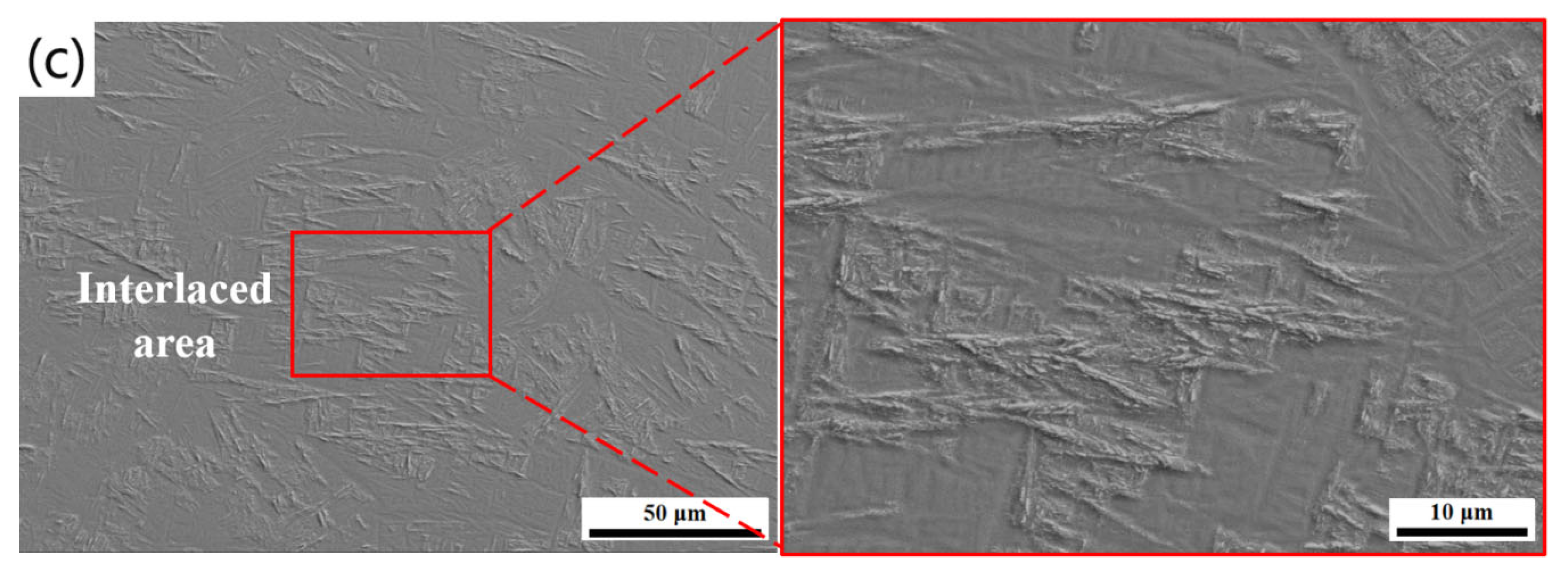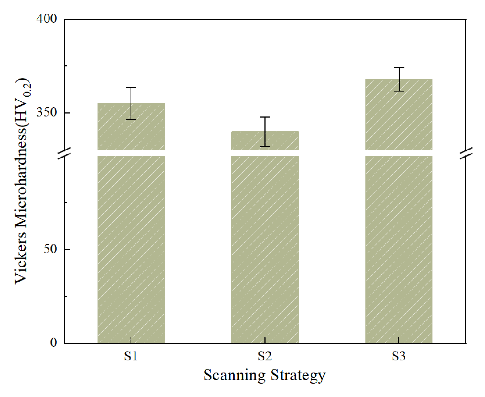 - All samples predominantly exhibit an interlaced distribution of needle-like α′ martensitic structures. Compared to alternating and stripe scanning strategies, the chessboard scanning strategy segments the scanning area and frequently changes the scanning path. This approach suppresses directional solidification and promotes an isotropic microstructure. Pole figures and inverse pole figures further confirm that the grain orientation in the chessboard-scanned samples is randomly distributed. These samples show the lowest random distribution density (6.605 mrd) and the weakest texture strength, significantly reducing anisotropy.