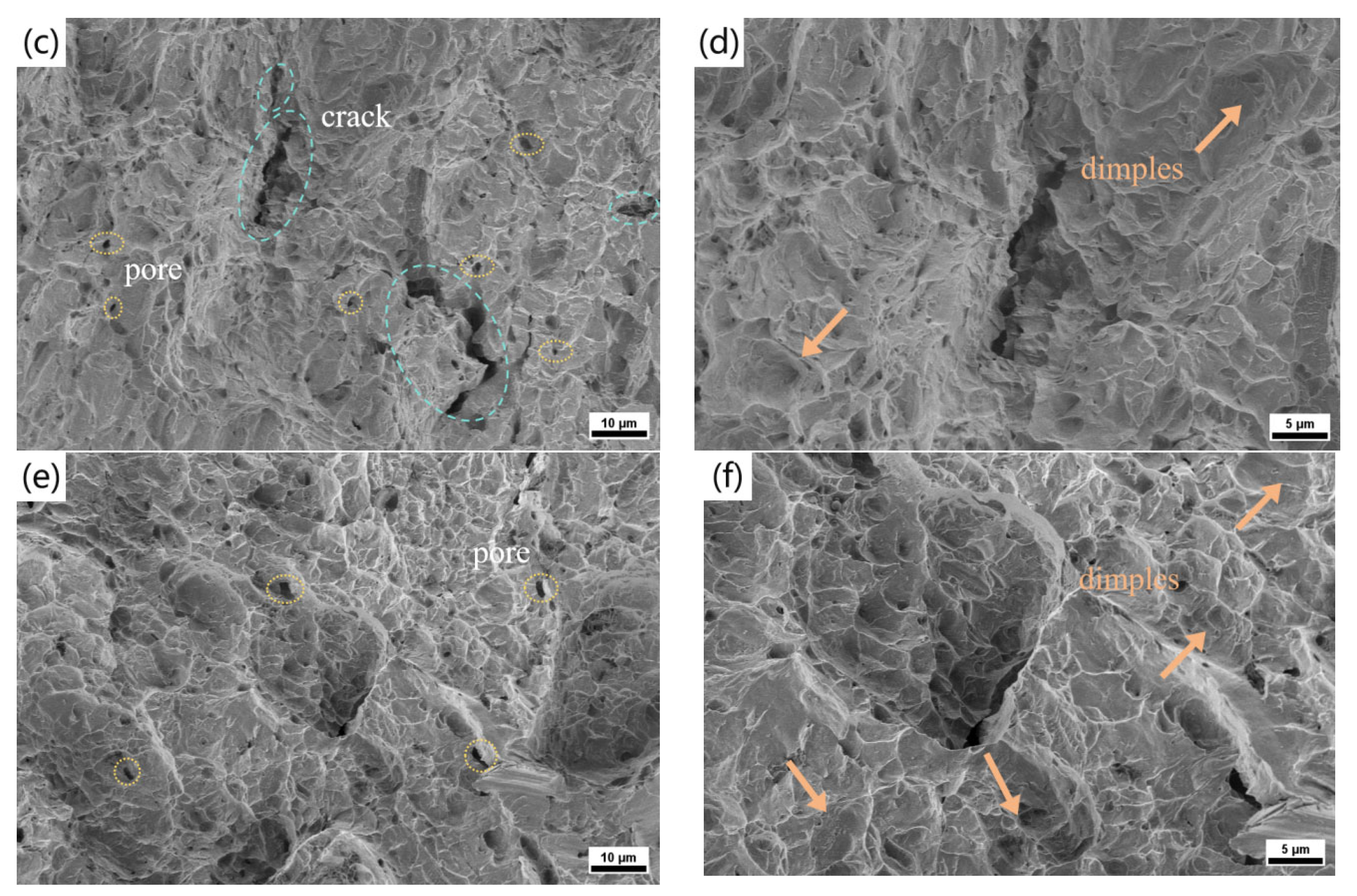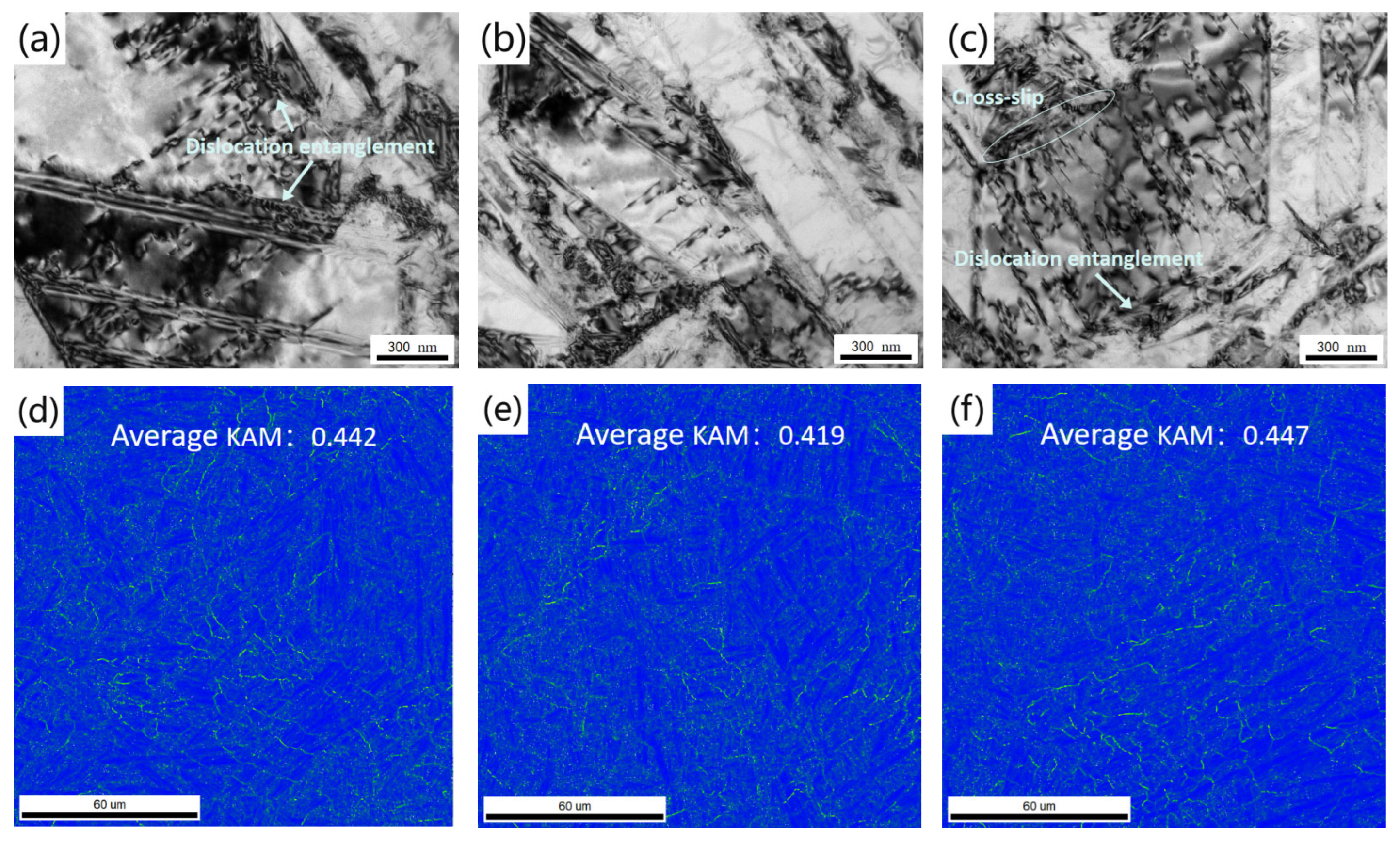 - The tensile fracture surface of the chessboard-scanned samples exhibits uniformly distributed ductile dimples, primarily governed by ductile fracture. In contrast, the fracture surface of the alternating and stripe scanning samples shows a mixed feature of dimples and cleavage, leading to reduced elongation. TEM combined with KAM mapping analysis reveals a higher dislocation density in the chessboard-scanned samples, with a complex network of cross-slip and dislocation entanglements.