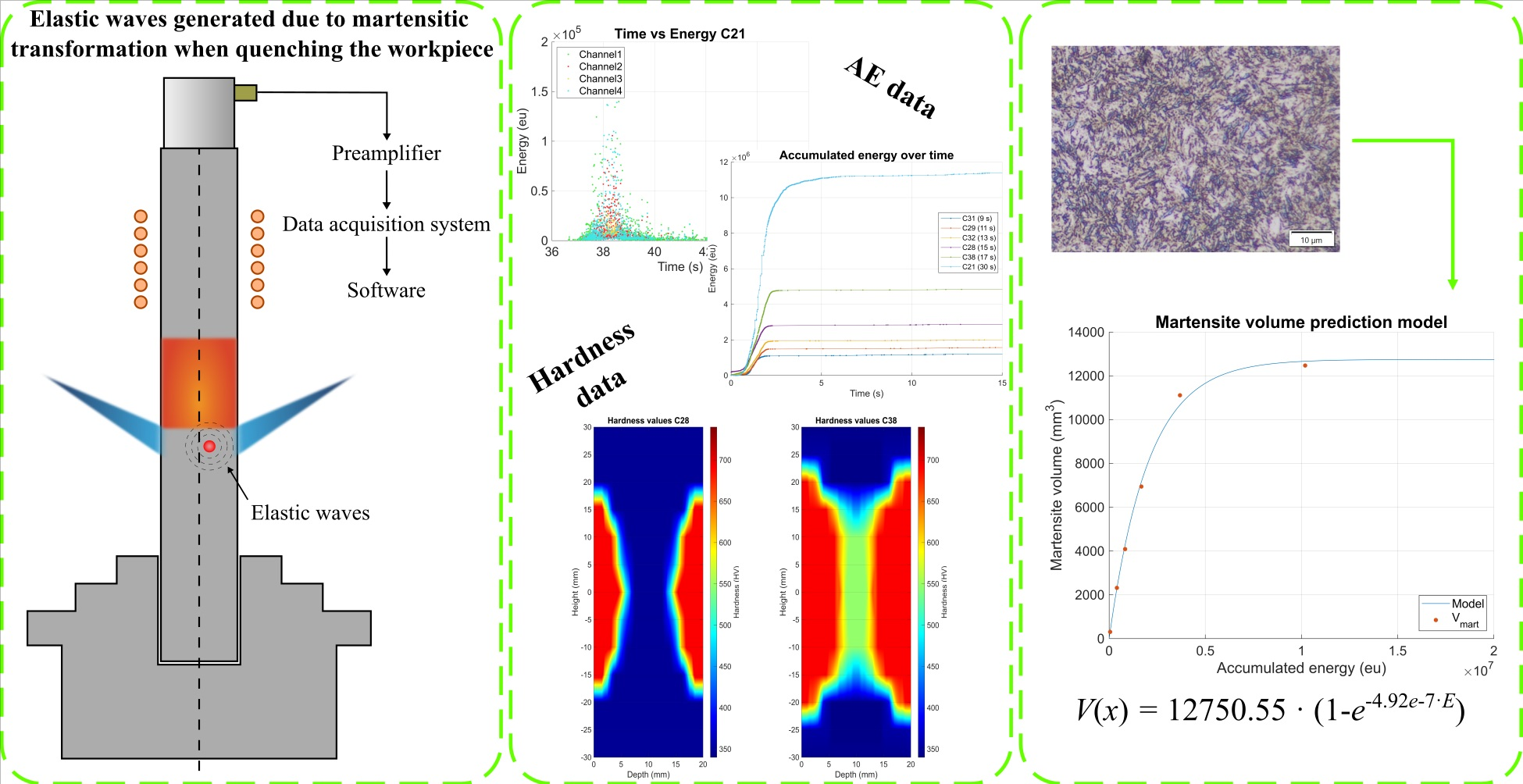 Given the material behavior during quenching and the ability to monitor the martensitic transformation of the microstructure through AE, a model has been proposed to estimate the transformed volume during the process. The proposed model is based on the behavior of the material being used with a simple geometry such as a cylindrical bar. The behavior in more complex geometries or materials to be heat treated will vary.