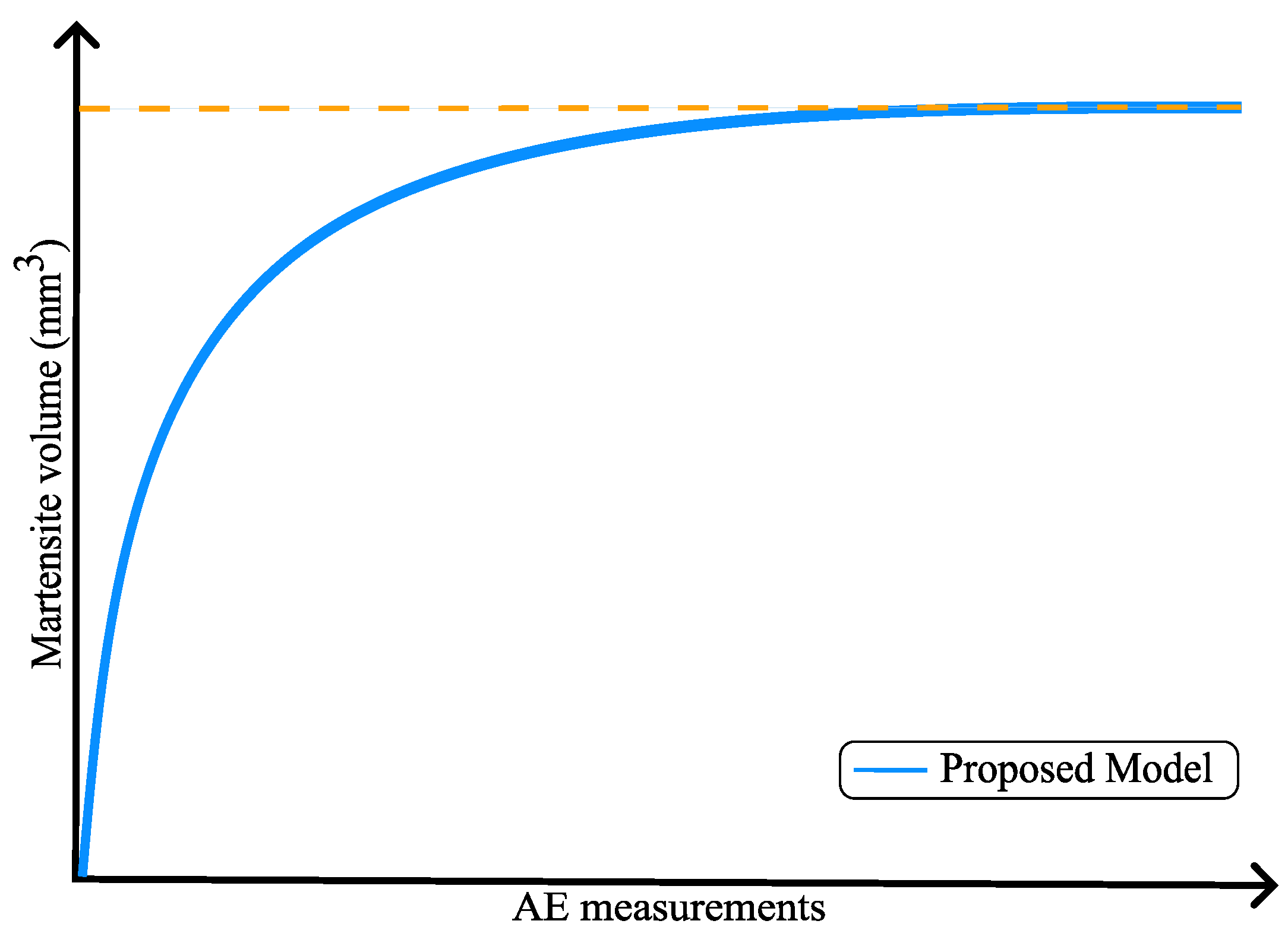 The model must satisfy the following characteristics: the curve should originate at the point (0, 0), as the absence of material transformation implies that no AE activity should be detected. The curve must also exhibit a horizontal asymptote, since the martensite volume will ultimately reach 100% of the quenchable fraction, depending on the hardenability of the material; once this limit is attained, no further AE signals associated with martensitic transformation are expected. The curve should display a steep initial slope, which gradually decreases as AE activity accumulates, until it approaches the horizontal asymptote.