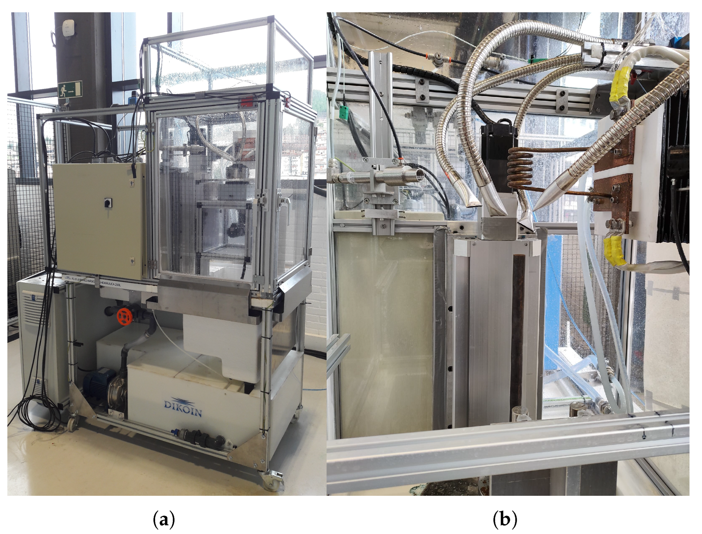 The quenching of the bars was performed on an induction quenching bench developed at the Ikerlan laboratory. Heating was achieved using a spring-shaped coil through which current flows, generating the required magnetic field. The coil is 60 mm in height, 30 mm in diameter, and consists of six turns. The bars were secured using clamping jaws and allowed two types of movement: rotational and vertical. For cooling, the bench is equipped with four hoses that direct the coolant onto the heated specimen. The coolant, consisting of water and 8% IBERTEMP-I synthetic quenching fluid, is stored in a tank connected to a pump that delivers the mixture to the hoses. Figure 2 illustrates the quenching bench manufactured at Ikerlan, including the interior of the cabin.