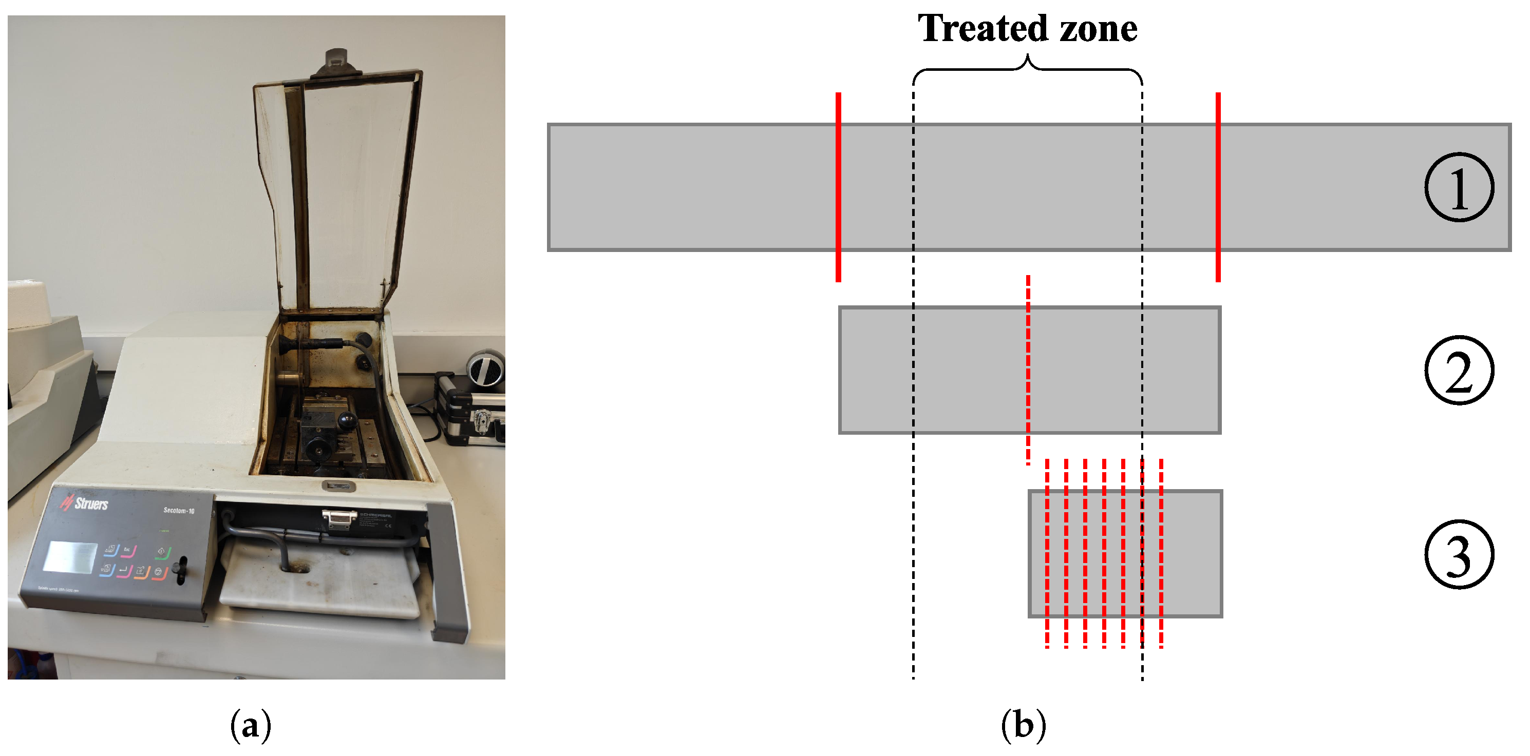 Figure 3. (a) Struers Secotom-10 (Struers, Ballerup, Denmark); (b) Diagram of the cuts made in the pieces.