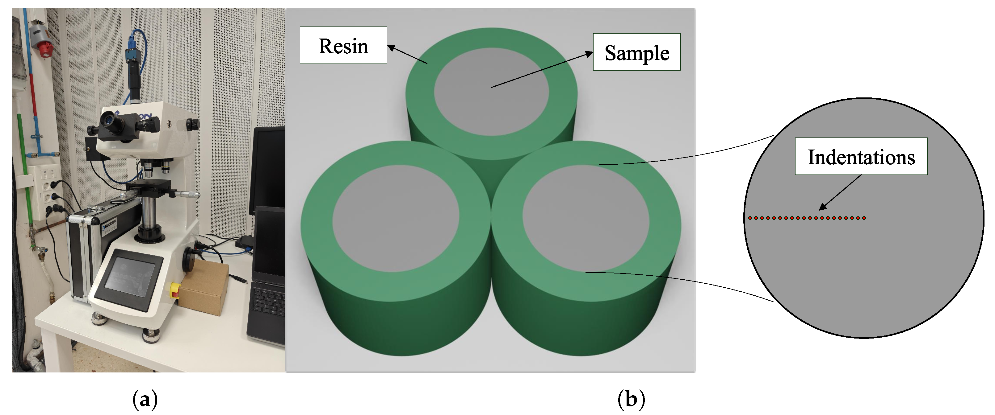 Vickers hardness tests were performed using a Sinowon MicroVicky VH1010 device (Sinowon, Dongguan, China). Twenty indentations were made at 0.5 mm intervals, with the first positioned 0.5 mm from the surface to avoid edge effects and the last located at the specimen center. Each indentation was produced with a load of 300 g applied for 14 s. Figure 4 shows the MicroVicky VH1010, along with a diagram of the prepared samples and the planned indentation positions for the Vickers hardness measurements.