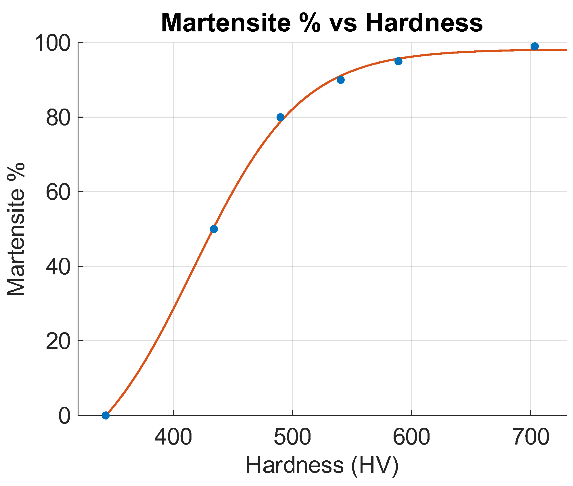 Based on the graph relating the carbon content of steel to hardness and martensite percentage of the book [22], a martensite percentage curve can be derived as a function of hardness (Equation (3)) for the case of a steel containing 0.41% carbon (Figure 5).