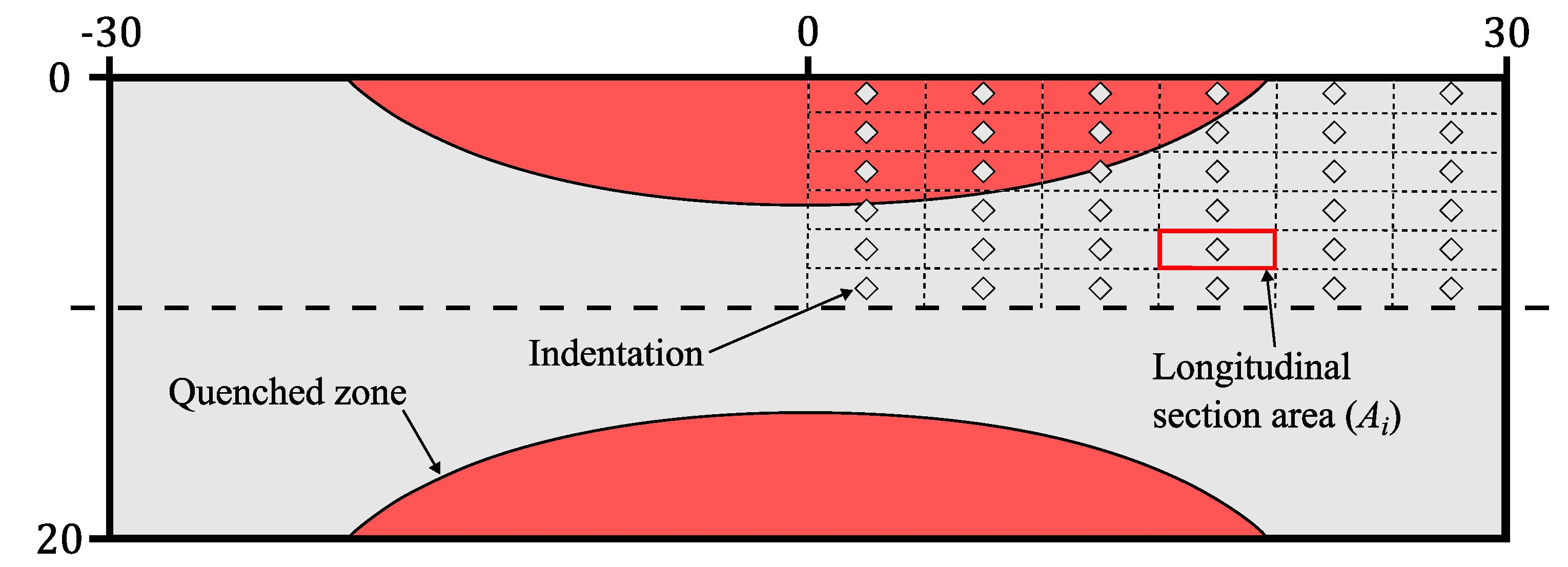 Since seven sections were obtained from each bar and 20 indentations were performed on each section, a 7 × 20 hardness matrix was generated for each hardened bar. The area of the longitudinal section of the bar corresponding to each matrix value was calculated ( A i ) (Figure 6), and the martensite percentage in each area ( M i ) was determined using Equation (3). Based on these data, the martensitic area ( M a r e a ) resulting from the heat treatment was estimated (Equation (4)), followed by the calculation of the total martensite volume ( M V ) (Equation (5)).
