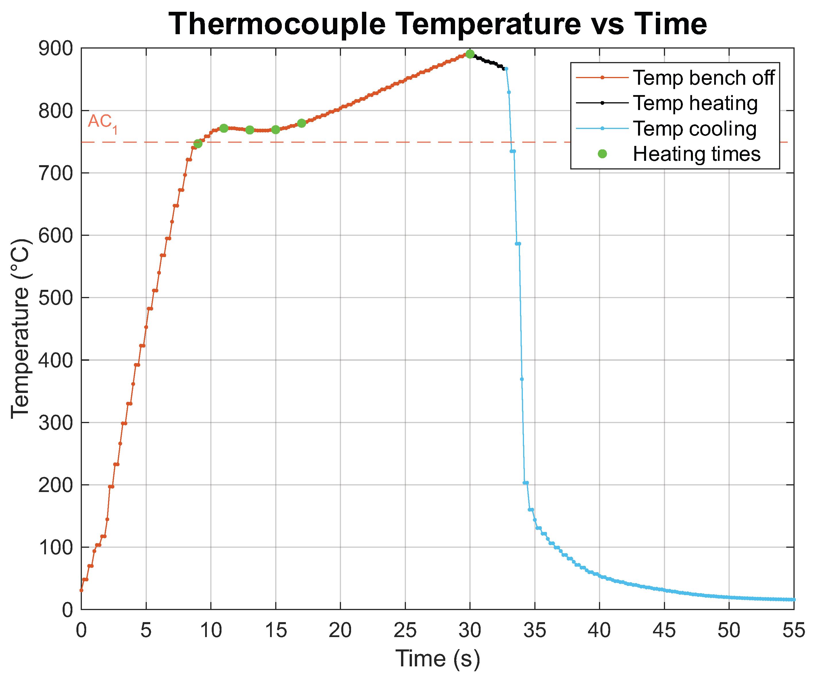 Three additional tests were conducted outside the defined heating times: a 6 s heating test to evaluate the measurements for a specimen that remained essentially unquenched, an 8 s test corresponding to the onset of martensitic transformation, and a 30 s test to ensure full quenching through the core of the bar.