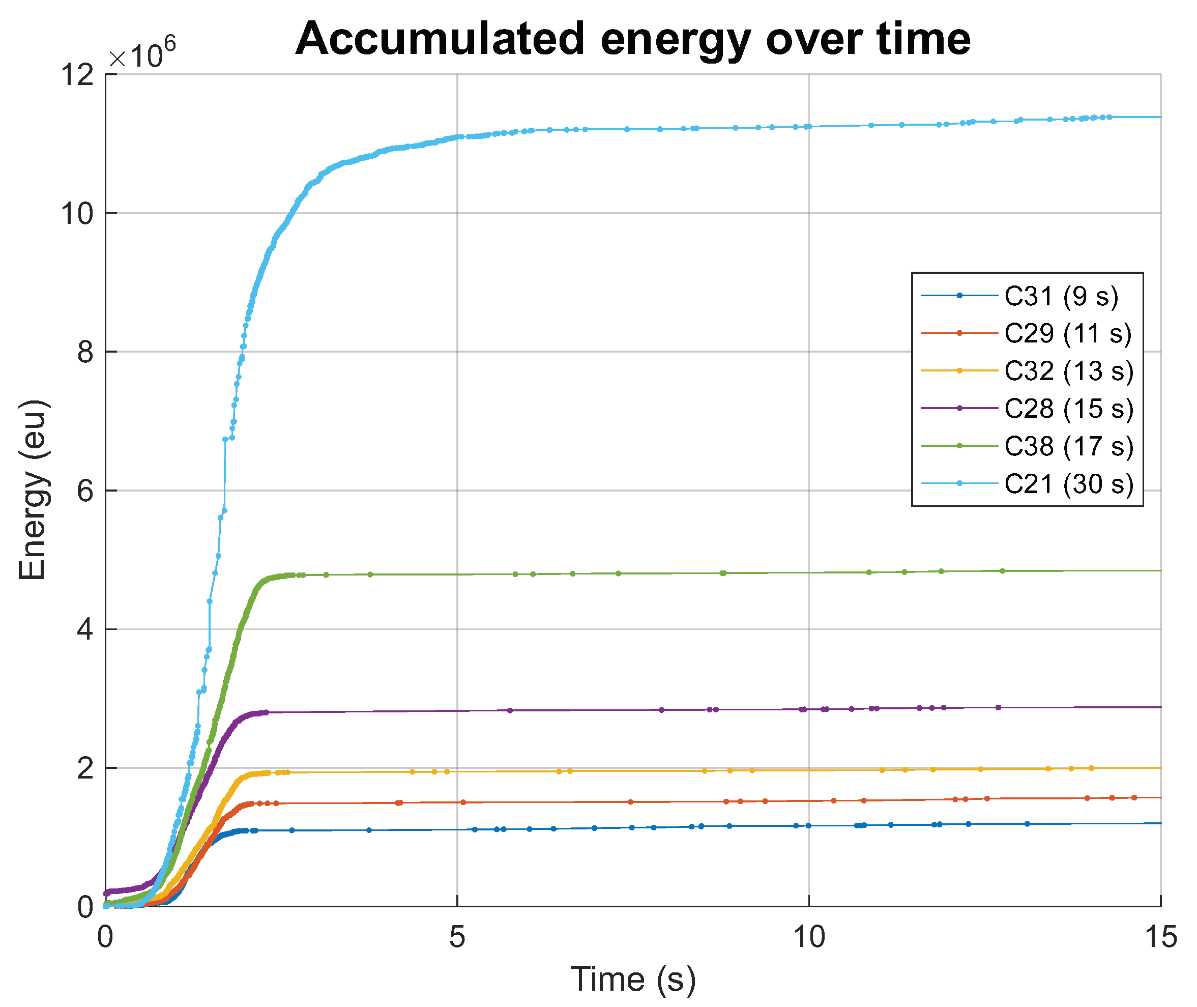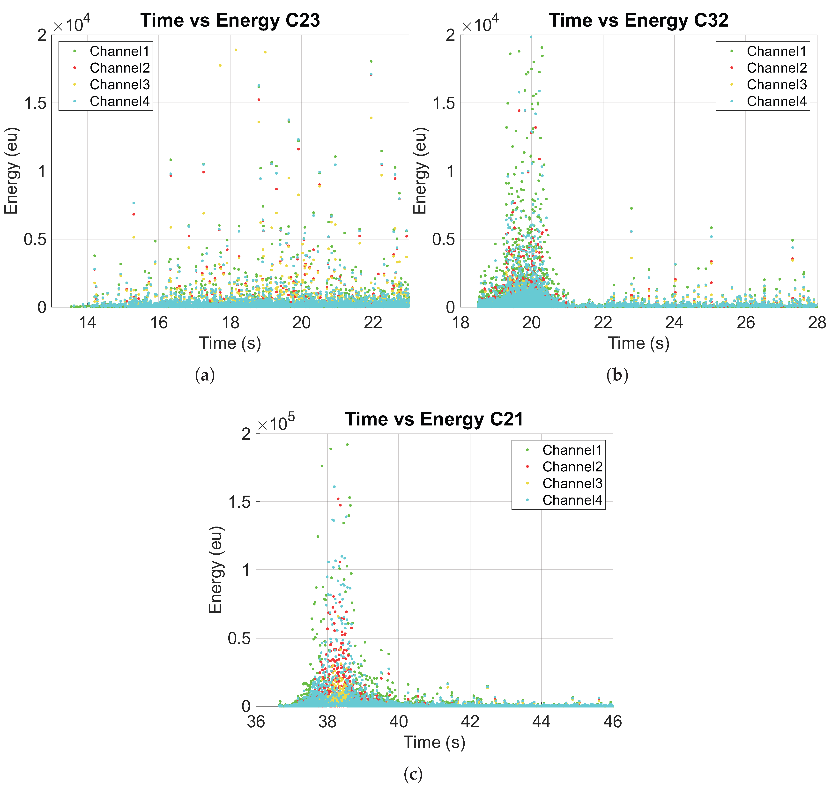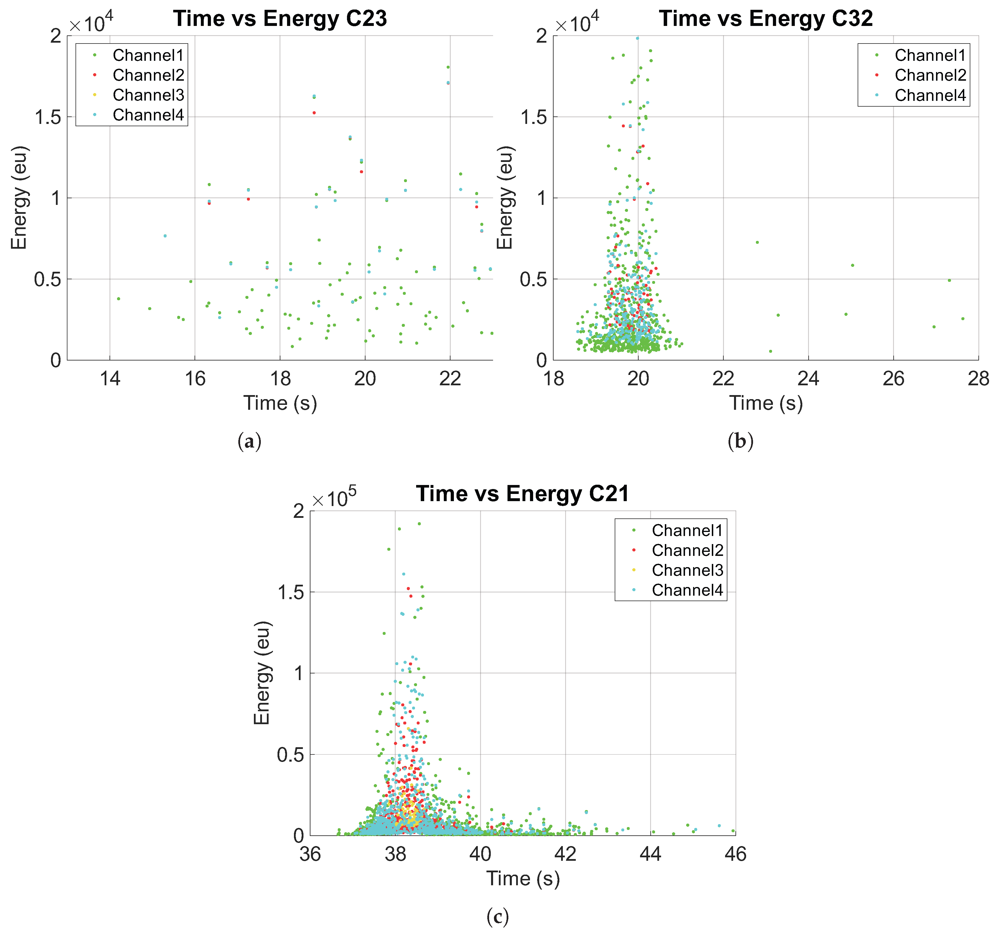 Figure 10. Energy vs. Time with duration filter > 400 µs: (a) C23; (b) C32; (c) C21.