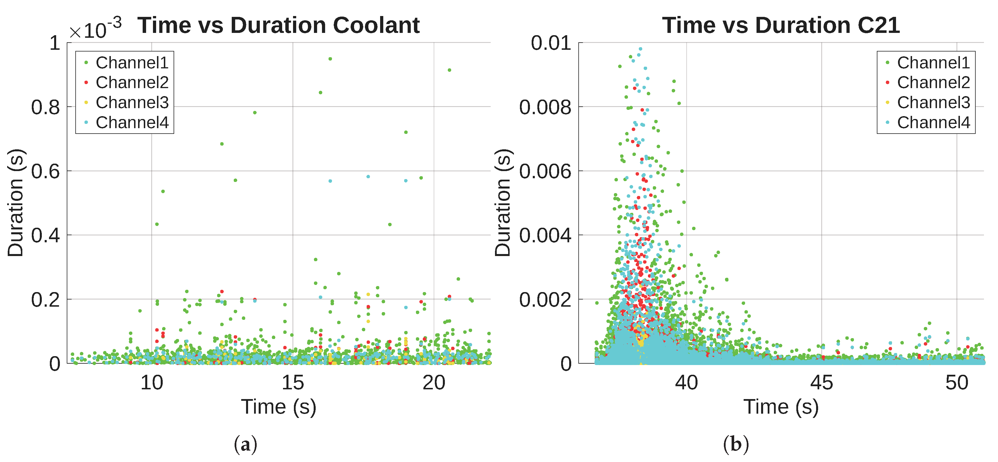 AE is a highly sensitive technique, and the measurements obtained may include signals unrelated to microstructural transformation, such as the impact of the coolant on the steel bar, boiling of the coolant at high temperatures, or external environmental noise. These undesired events must be filtered out; for this purpose, a duration-based filter was implemented to remove the majority of irrelevant signals.