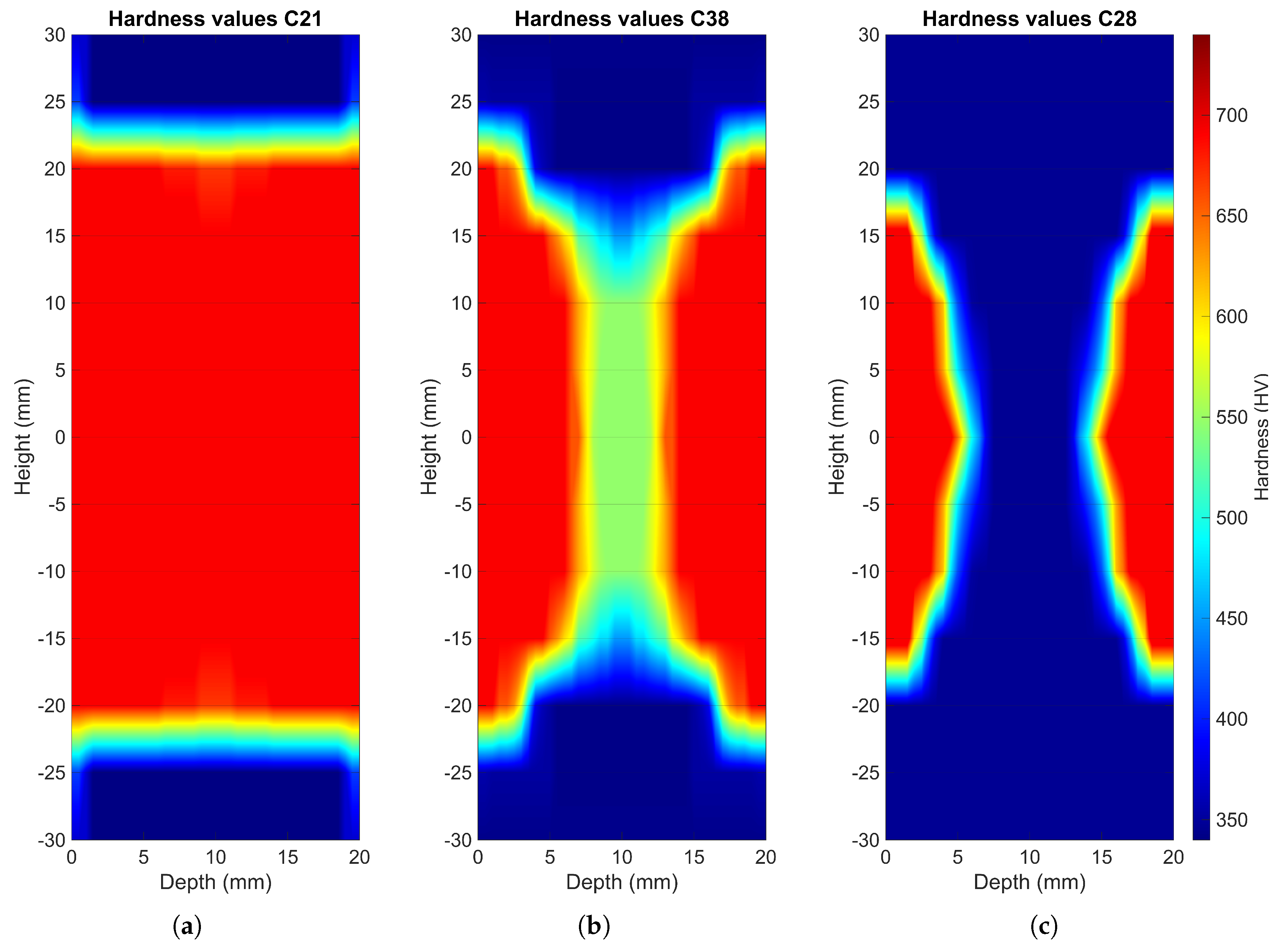 Although only the upper half of the heat-treated zone was measured, the samples for analysis were cut from the midsection to the top. Symmetrical heating by the inductor was assumed, and consequently, the hardness distribution was considered symmetrical across both halves of the bar.