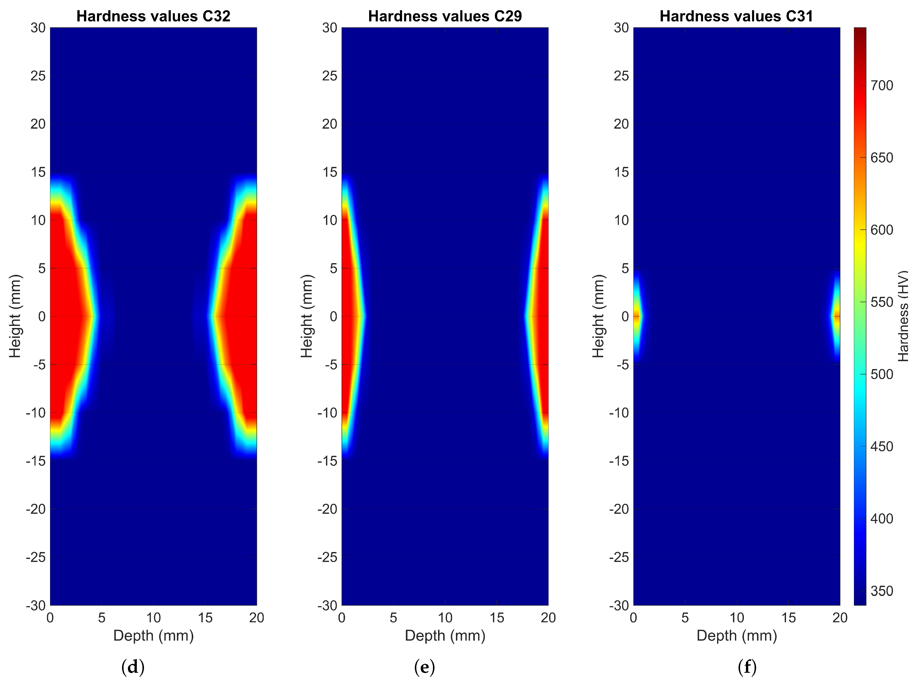 Figure 12. Vickers hardness values of quenched zones: (a) C21; (b) C38; (c) C28; (d) C32; (e) C29; (f) C31.