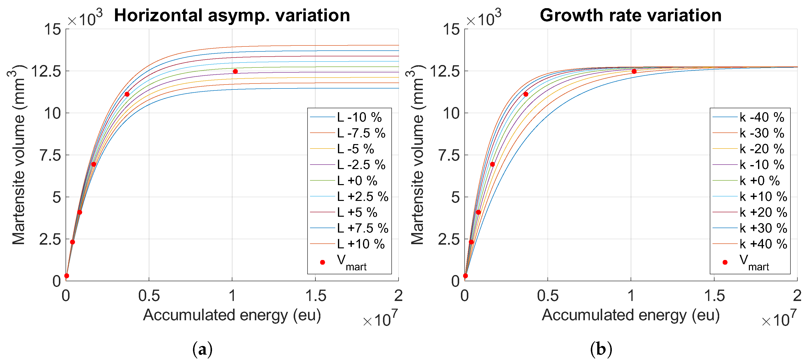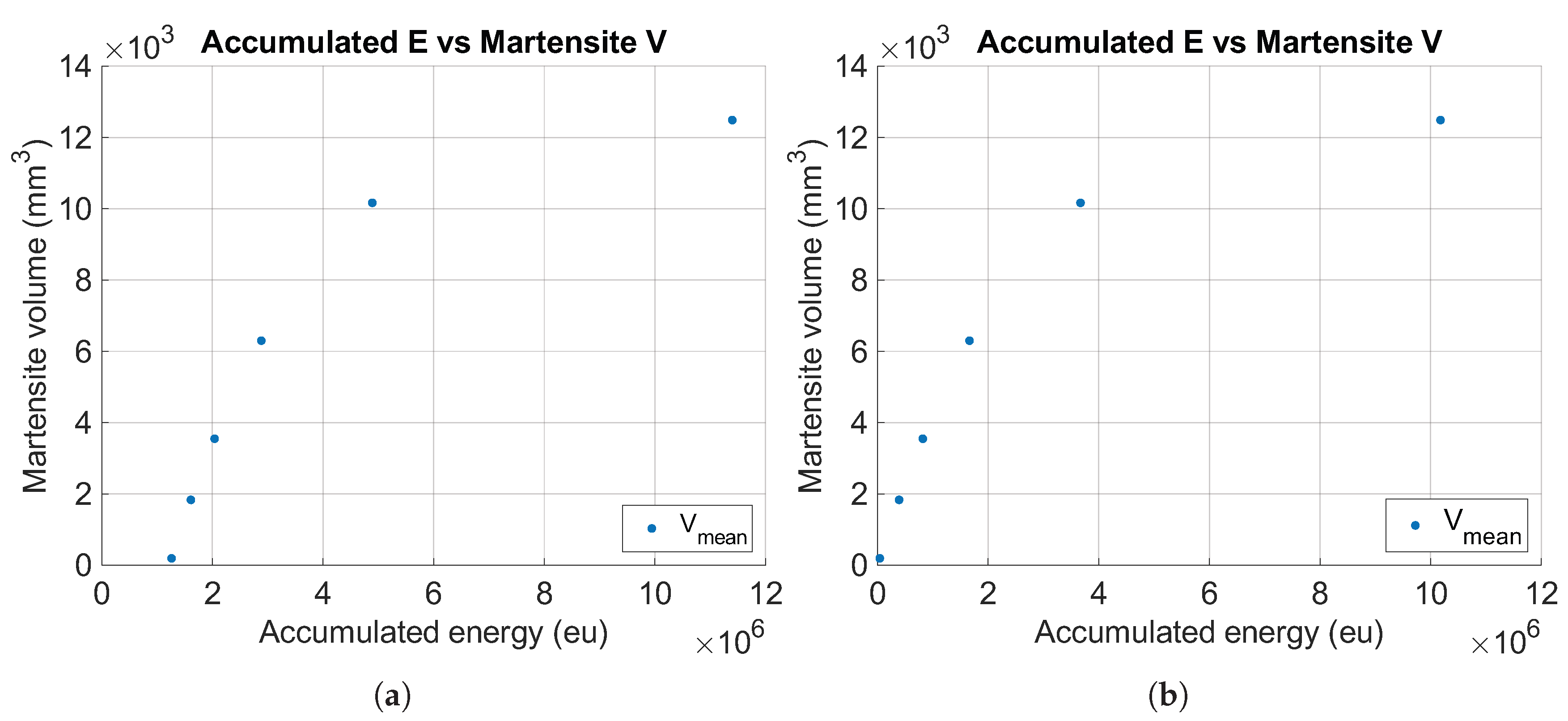 Figure 14. Accumulated energy vs Martensite volume: (a) Raw energy values; (b) Adjusted energy values.