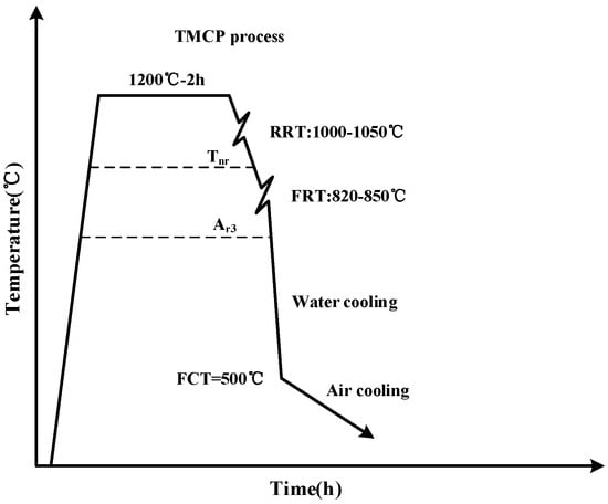 The chemical compositions of the experimental steel are detailed in Table 1. The 80 mm thick plate was produced via TMCP using a two-stand reversible mill with a roll length of 4300 mm. The steel plate was supplied by China Railway Shanhaiguan Bridge Group Co., Ltd. (Qinhuangdao, China). The technological process is shown in Figure 1. The key thermal-mechanical parameters in Figure 1 are defined as follows: Tnr is the non-recrystallization temperature, Ar3 is the austenite-to-ferrite transformation start temperature, and FCT is the finish cooling temperature. First, the continuous casting slab was reheated at 1200 °C for 2 h to achieve microstructural homogenization and to dissolve second-phase particles. Subsequently, the slab was rolled to a thickness of 80 mm at a rough rolling temperature (RRT) of 1000–1050 °C and a finish rolling temperature (FRT) of 820–850 °C. The steel plate was then forced water cooled to the phase transformation critical point of 500 °C at a rate of 20 °C/s through an accelerated cooling system (ACC), and it was then finally air cooled to room temperature to complete microstructural regulation.