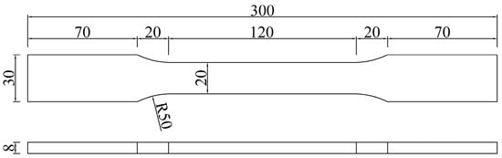 Schematic diagram of the tensile specimens (unit: mm).