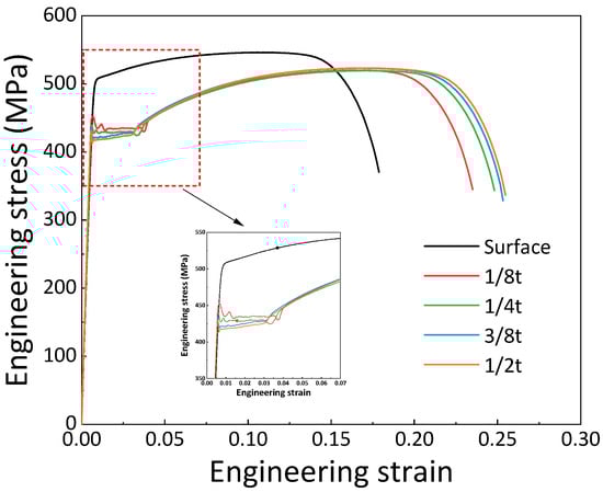 The curves reveal a pronounced difference in the yielding behavior between the surface and core regions of the experimental steel. The surface tensile specimens exhibited continuous yielding, while the specimens from 1/8t to 1/2t displayed discontinuous yielding characteristics with distinct yield plateaus.