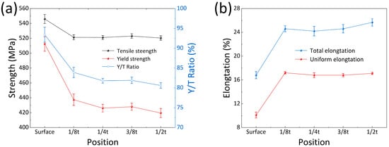 As presented in Table 2 and Figure 5, the mechanical properties exhibited significant gradient variations along the thickness direction. From the surface to the 1/2t, the yield strength and tensile strength decreased from 512.4 MPa to 419.5 MPa and 545.9 MPa to 520.4 MPa, representing reductions of 18.1% and 4.7%, respectively. Overall, the yield strength showed significantly greater reduction than the tensile strength, leading to a decrease in the yield-to-tensile ratio from 0.93 to 0.81 with a 12.9% reduction, demonstrating enhanced plastic deformation capability and higher strength safety margins in the core region. Notably, approximately 80 percent of the strength gradient variation was concentrated between the surface and 1/8t (Figure 5a). Within this critical zone, the yield strength and tensile strength decreased from 512.4 MPa to 437.4 MPa and 545.9 MPa to 521.3 MPa, representing reductions of 14.6% and 4.5%, respectively, whereas the mechanical properties showed minimal variation from 1/8t to 1/2t. The elongation parameters exhibited an inverse gradient characteristic compared to the strength properties. From the surface to 1/2t, both the total elongation and uniform elongation increased from 0.168 to 0.258 and 0.101 to 0.171, representing increases of 53.6% and 69.3%, respectively. The elongation enhancement primarily concentrated in the near-surface region (Figure 5b), providing further evidence of the superior plastic deformation capacity in the core region.