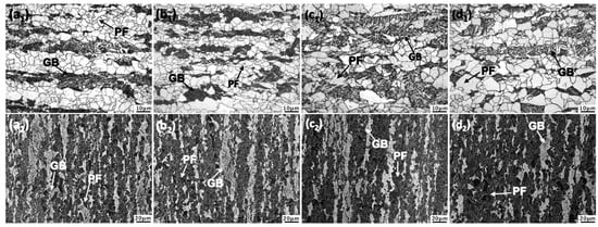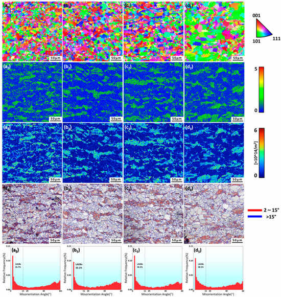 Figure 10(a4–d4) present composite maps combining the grain boundary misorientation data with the band contrast (BC) information. The high-brightness regions with increased BC values in the BC maps correspond to the ferrite grains that exhibited superior crystalline integrity, whereas the low-brightness areas with decreased BC values represent bainitic structures that contained higher defect densities and inferior Kikuchi band diffraction quality []. The red and blue lines in the grain boundary misorientation maps designate low-angle grain boundaries (LAGBs, with GB misorientations lower than 15°) and high-angle grain boundaries (HAGBs, with GB misorientations higher than 15°), respectively. The boundary analysis confirmed that the LAGBs were primarily concentrated in the bainitic phases, exhibiting a distribution pattern that aligned with the substructural characteristics observed in the IPF mapping. These sub-boundaries, mainly formed by dislocation rearrangement, generally displayed misorientation angles below 15°. Conversely, the HAGBs were predominantly located at intergranular regions, indicating significant crystallographic orientation differences between neighboring grains.