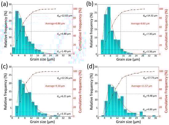 The distributions of grain sizes: (a) surface, (b) 1/8t, (c) 1/4t, and (d) 1/2t.