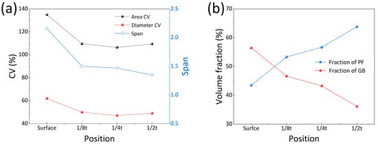where d10, d50, and d90 represent the particle diameters at the 10th, 50th, and 90th percentiles of the cumulative volume distribution, respectively; σ is the standard deviation; and davg is the mean value of the dataset. The span parameter quantifies the breadth of the grain size distribution (d10 to d90). A larger span value indicates a wider distribution range and greater microstructural heterogeneity, whereas a smaller value signifies a more uniform grain size distribution. The grain size span values at the surface, 1/8t, 1/4t, and 1/2t positions were 2.16, 1.50, 1.47, and 1.35, respectively. The surface span values exhibited increases of 30.6%, 31.9%, and 37.5% relative to the inner layers, indicating substantial expansion of the primary grain size distribution range at the surface. The CV values based on equivalent diameter measurements were 62.0%, 50.1%, 47.2%, and 49.1% at the surface, 1/8t, 1/4t, and 1/2t positions, respectively, while the area-based CV values were 134.9%, 109.6%, 106.5%, and 109.5% at these corresponding locations. The significantly higher CV values at the surface layer revealed substantially greater grain size heterogeneity compared to the inner regions. The fraction of bainite gradually decreases from the surface to the 1/2t position, whereas the fraction of ferrite shows an increasing trend.