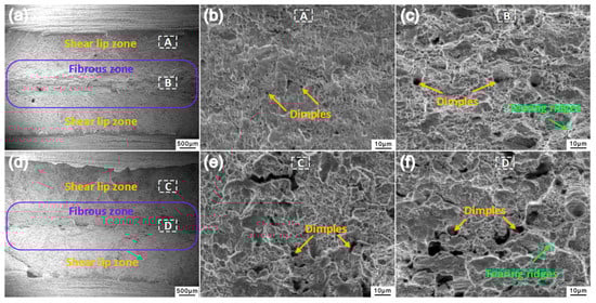 Low-magnification analysis (Figure 9a,d) revealed that all of the tensile fracture surfaces exhibited fibrous zones and shear lips without observable radial markings, consistent with classical ductile fracture morphology patterns [].