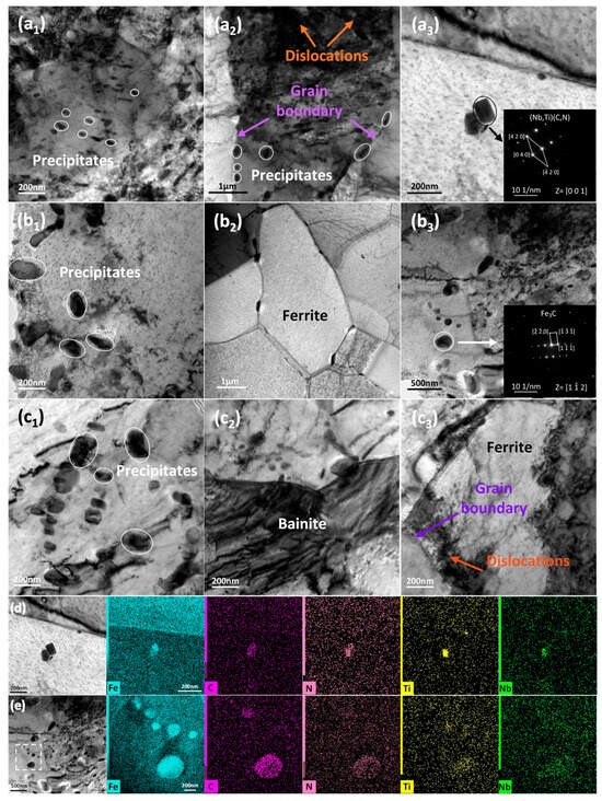 TEM micrographs and EDS analysis of the experimental steel at different thicknesses: (a1–a3) morphological image at surface, (b1–b3) morphological image at 1/4t, (c1–c3) morphological image at 1/8t, (d) EDS element map corresponding to a3, and (e) EDS element map corresponding to (b3).