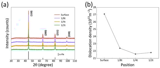 Figure 12b displays the calculated dislocation density values at different thicknesses. The values at the surface, 1/8t, 1/4t and 1/2t positions were 27.1 × 1013 m−2, 22.4 × 1013 m−2, 21.6 × 1013 m−2, and 21.8 × 1013 m−2, respectively. The surface exhibits significantly higher dislocation densities compared to the core region.
