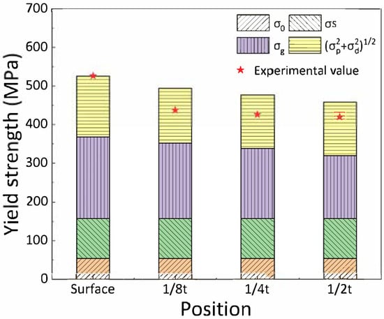 where M, a, and μ are the Taylor factor (about 2.2 for ferrite []), the crystal structure-dependent constant (0.2 for ferrite), and the shear modulus (81,600 MPa for ferrite), respectively; and b and ρ are the Burger’s vector of 0.248 nm and the dislocation density, respectively. Based on the dislocation density values determined from the XRD data using the modified W-H method, the calculated σd values were 146.6 MPa, 133.3 MPa, 130.9 MPa and 131.5 MPa for the surface, 1/8t, 1/4t, and 1/2t positions, respectively.