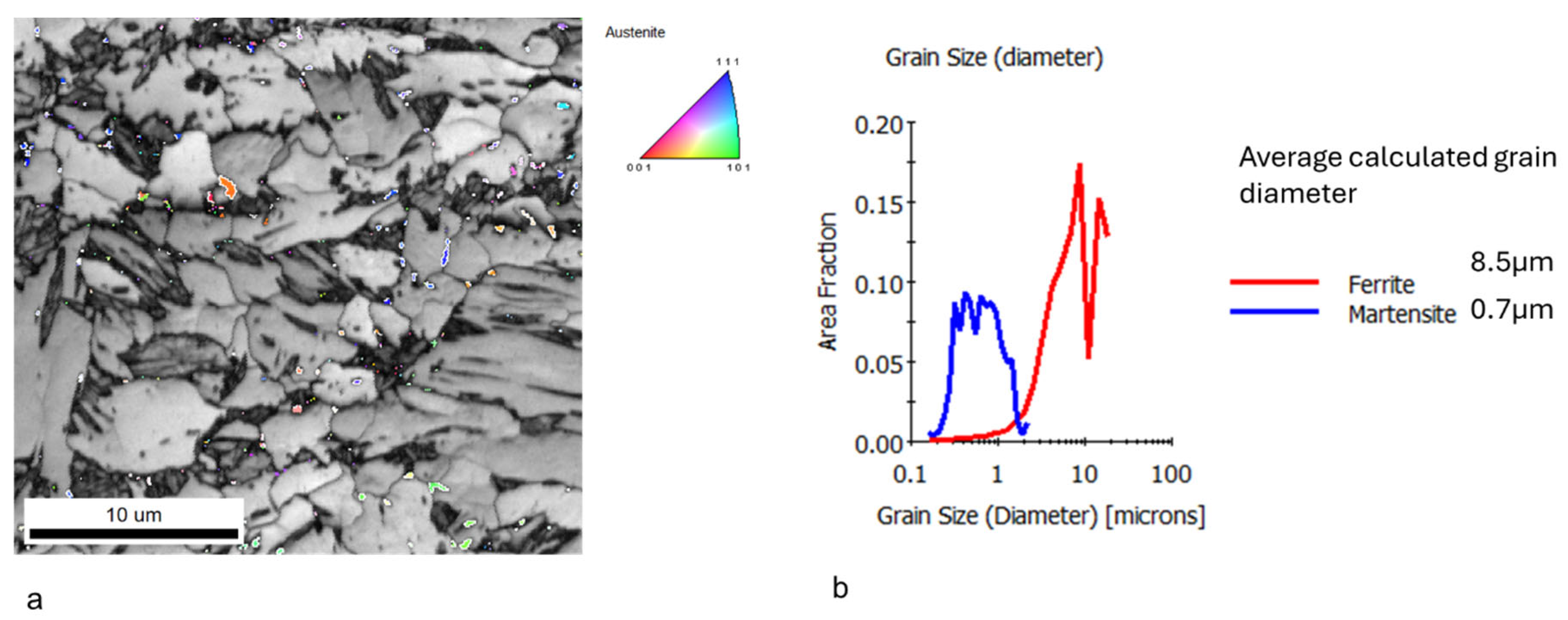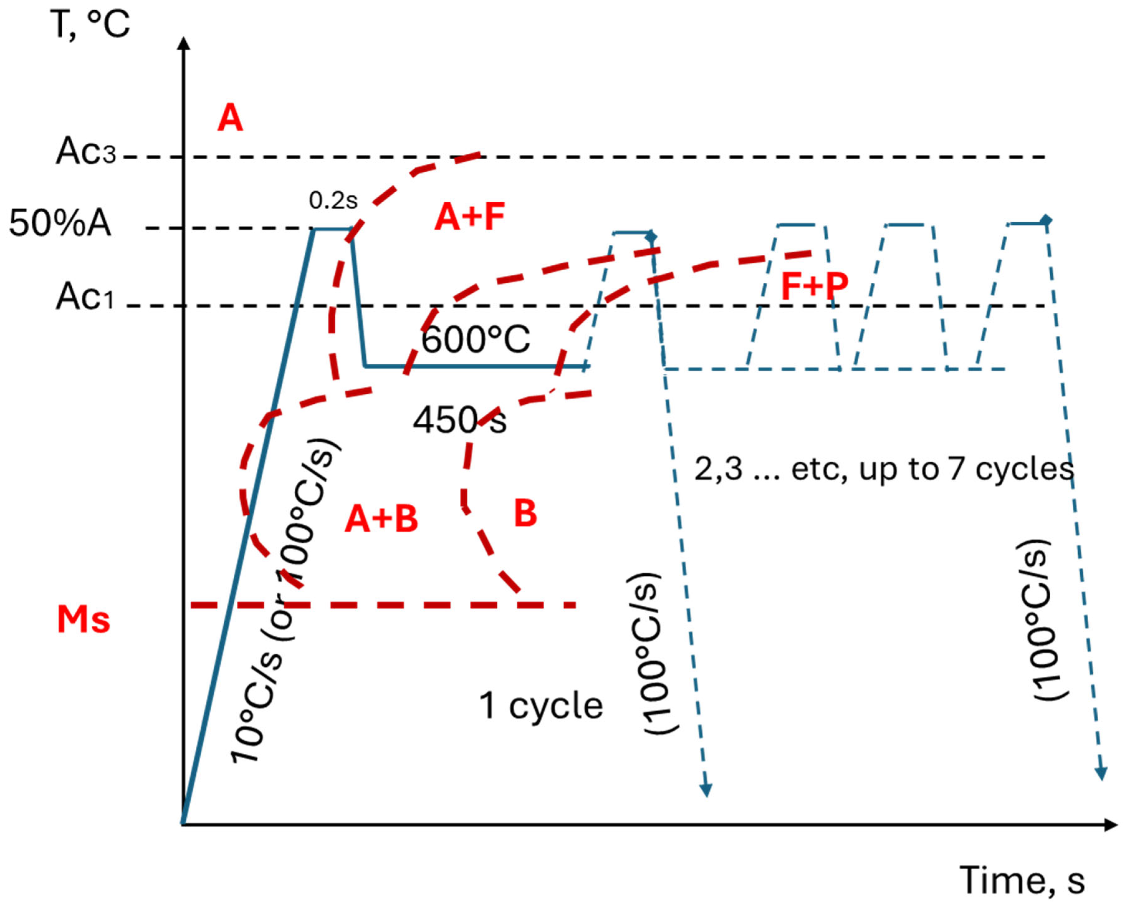- Repeated thermal cycling enhances carbon and manganese diffusion toward transformed regions, resulting in the formation of banded microstructures and a reduction in the martensite start (Ms) temperature due to solute enrichment of intercritical austenite. Crystallographic texture analysis further indicates recrystallization of both BCC and FCC constituents, even at rapid heating rates of 100 °C/s.