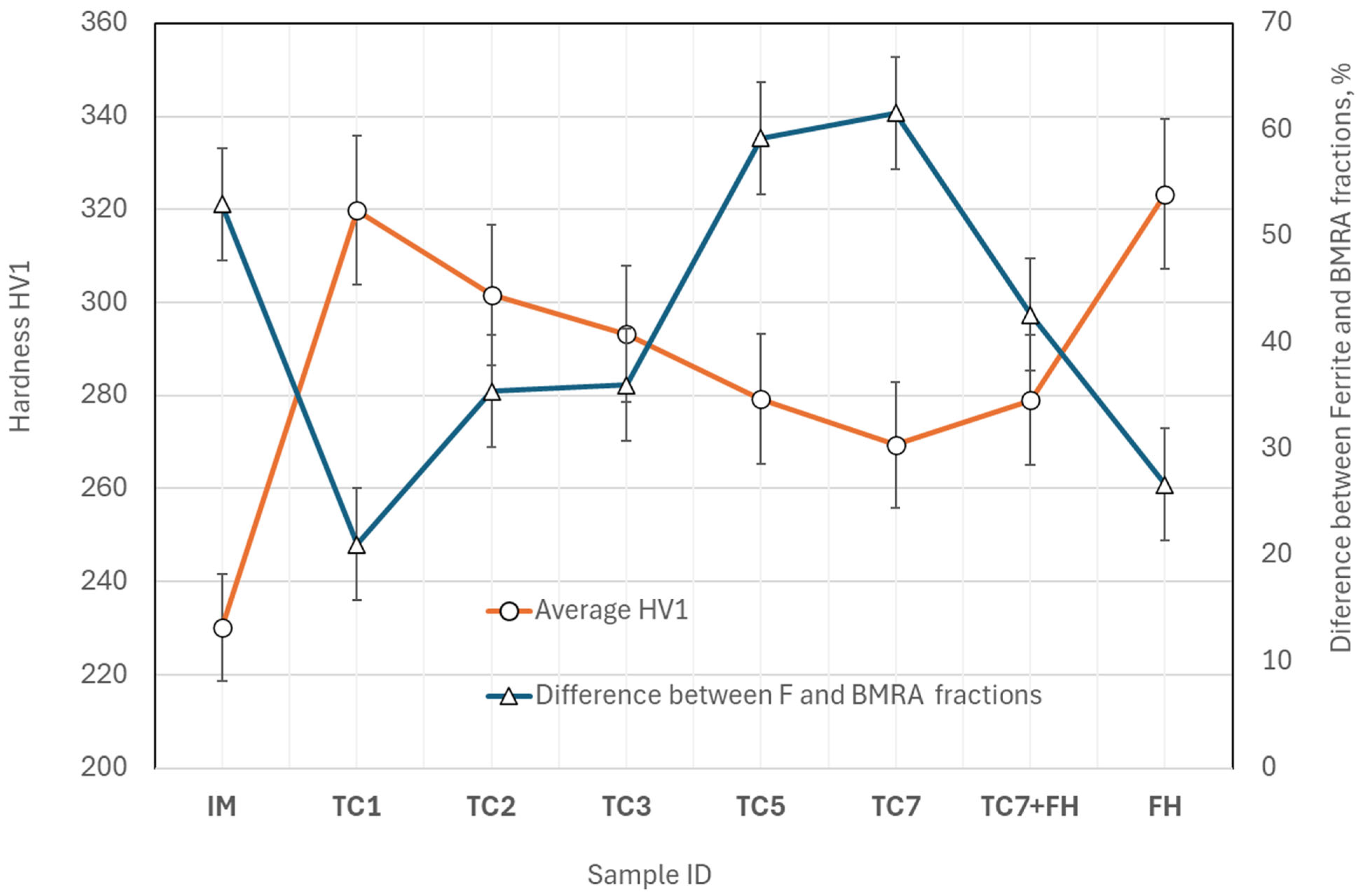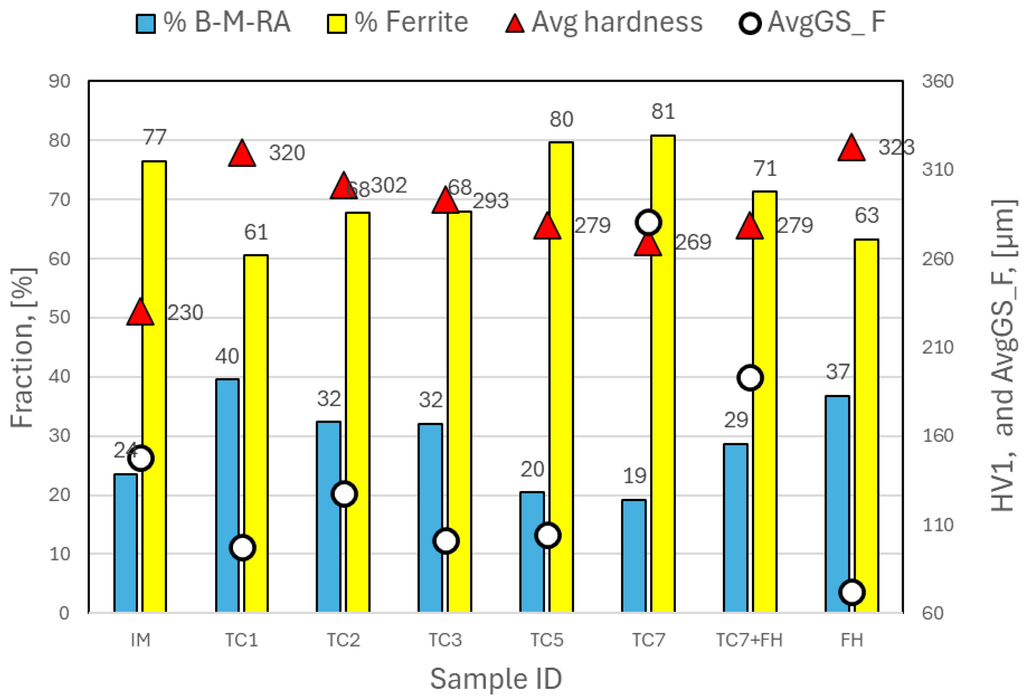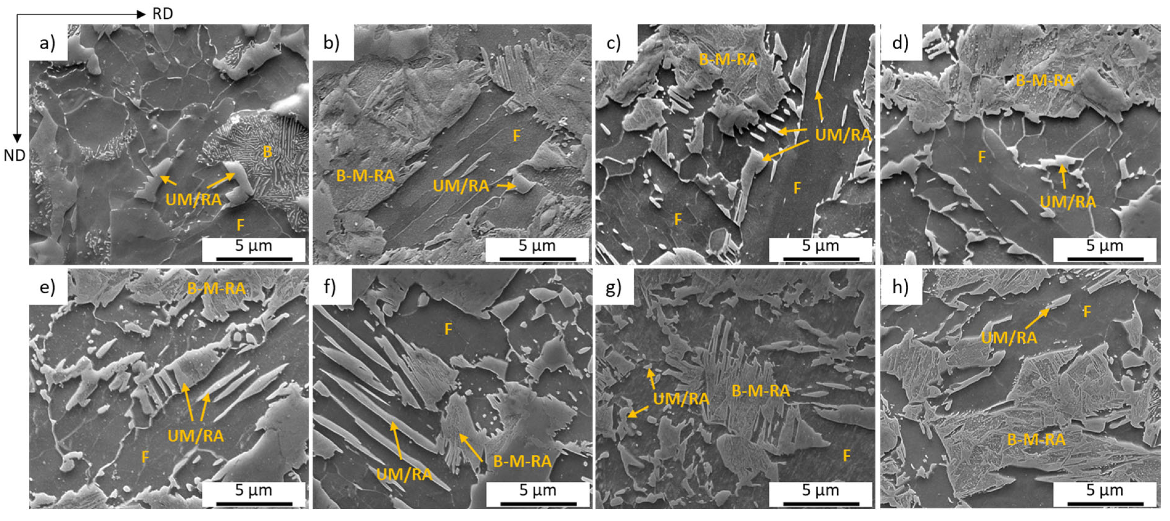 - Thermal cycling produces a pronounced grain-refining effect in both the prior austenite grains (PAGs) and the B-M-RA structures, with refinement intensifying as the number of cycles increases. However, excessive cycling or the addition of a fast-heating (FH) step after multiple cycles leads to grain coarsening. Ferrite grain size shows no consistent trend but tends to increase after several cycles, while FH samples consistently exhibit the smallest overall grain sizes.