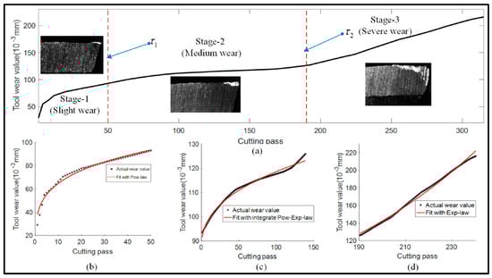 Liu et al. Reprinted from Ref. [] divided the typical tool degradation process into three stages based on the wear rate; (a) Typical degradation process of the tool; (b) Running-in stage; (c) Steady wear stage; (d) Severe wear stage.