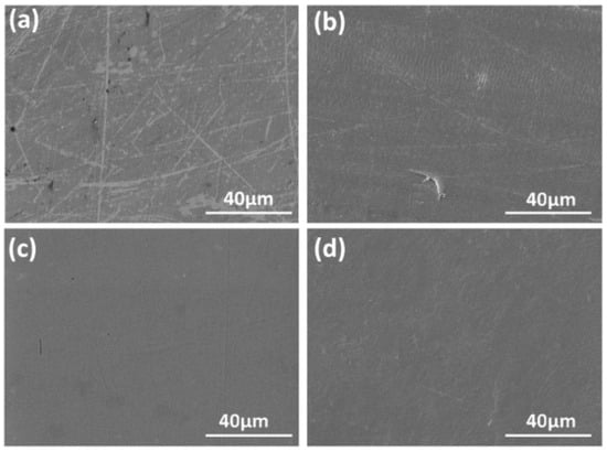 In 2018, Zai prepared a zirconia coating on the surface of a CoCrMo alloy via the sol–gel method while introducing graphene sheets into the UHMWPE matrix, which significantly improved the comprehensive performance of the joint surface. Both the friction coefficient and wear volume were reduced by 50%. This synergistic modification strategy effectively mitigates the easy wear of polymers and the easy corrosion of metals in traditional metal-polymer joints. The lubricating effect of graphene enhanced the wear resistance of UHMWPE, whereas the dense ZrO2 coating significantly improved the corrosion resistance of CoCrMo. The optimal ratio (ZrO2-CoCrMo (T500) and UHMWPE-G (0.2%)) exhibited a wear resistance 19.5 times higher than that of the untreated materials. Observing the worn surfaces shown in Figure 3, the surfaces in Figure 3a,b are rougher than those in (c) and (d). This provides a new solution for the long-term service of artificial joints.