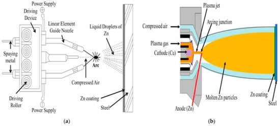 Jitendra et al. Reprinted from Ref. [] presented the schematic representation of (a) arc and (b) plasma arc thermal spraying processes.