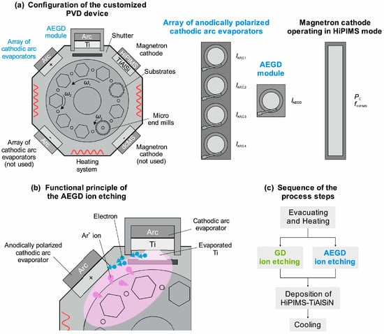- Nelson, F.L.D.; Alexander, L.M.; Christoph, P.J.; Alexander, F.; Dirk, B.; Wolfgang, T. Arc-enhanced Glow Discharge Ion Etching of WC-Co Cemented Carbide for Improved PVD Thin Film Adhesion and Asymmetric Cutting Edge Preparation of Micro Milling Tools. Surf. Coat. Technol. 2024, 491, 131166. [Google Scholar]