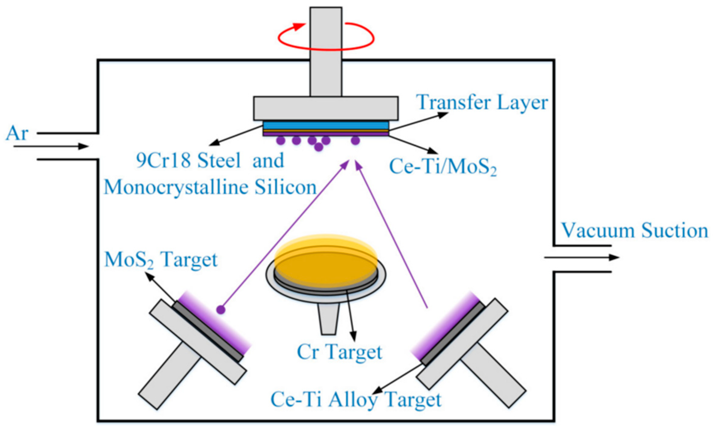 - Tian, C.L.; Cai, H.C.; Xue, Y.J. Effect of Working Pressure on Tribological Properties of Ce-Ti/MoS2 Coatings Using Magnetron Sputter. Coatings 2022, 12, 1576. [Google Scholar] [CrossRef]