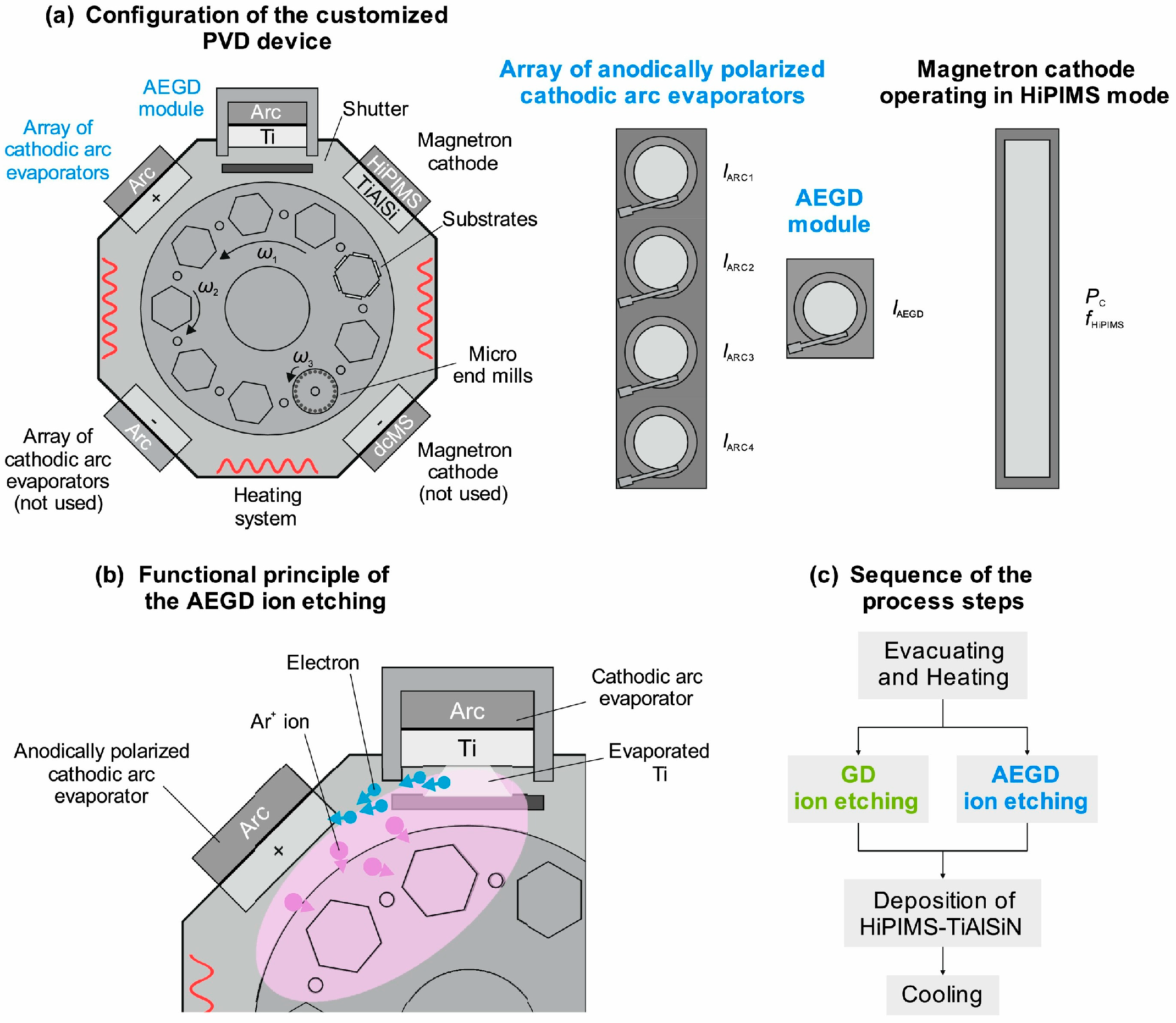 - Nelson, F.L.D.; Alexander, L.M.; Christoph, P.J.; Alexander, F.; Dirk, B.; Wolfgang, T. Arc-enhanced Glow Discharge Ion Etching of WC-Co Cemented Carbide for Improved PVD Thin Film Adhesion and Asymmetric Cutting Edge Preparation of Micro Milling Tools. Surf. Coat. Technol. 2024, 491, 131166. [Google Scholar]
