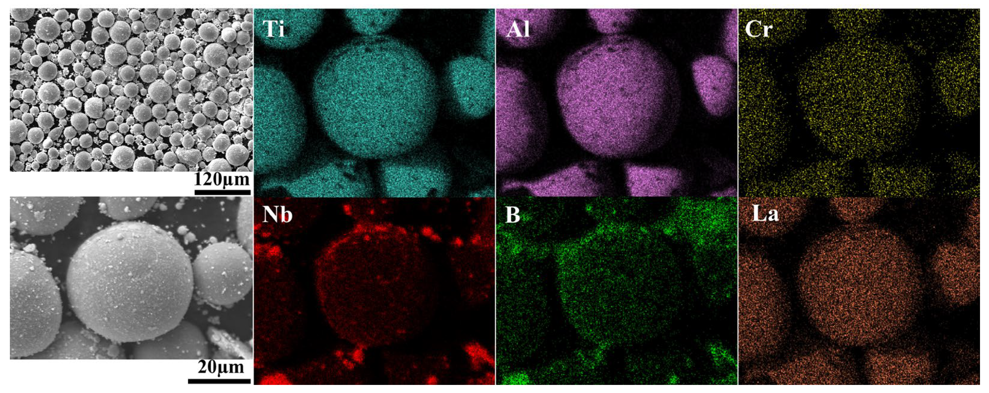 Near-spherical gas-atomized Ti-48Al-2Cr-2Nb (at.%) pre-alloyed powder (Suzhou Jiuchun New Materials Technology Co., Ltd., Suzhou, China) with a particle size range of 15–53 µm was selected as the base material. Nb nanoparticles with an average size of ~50 nm were first added to reach a nominal 8 at.% Nb, followed by the addition of LaB6 submicron particles with an average size of ~200 nm at a mass fraction of 0.5 wt.%. The mixed powders were homogenized using a QM-3SP4 horizontal planetary high-energy ball mill (Nanjing Nanda Instrument Co., Ltd., Nanjing, China). The milling parameters were set to a rotation speed of 200 rpm, a ball-to-powder weight ratio of 2:1, and a total milling duration of 2 h. Each milling cycle consisted of 15 min of operation followed by a 5 min rest for cooling, with the equipment operating in an alternating forward–reverse mode to ensure uniform mixing. After this process, the nominal chemical composition of the obtained composite powder was Ti-45.01Al-1.88Cr-7.99Nb-0.1La-0.62B (at.%). The surface morphology and elemental distribution of the ball-milled mixed powders are shown in Figure 1.