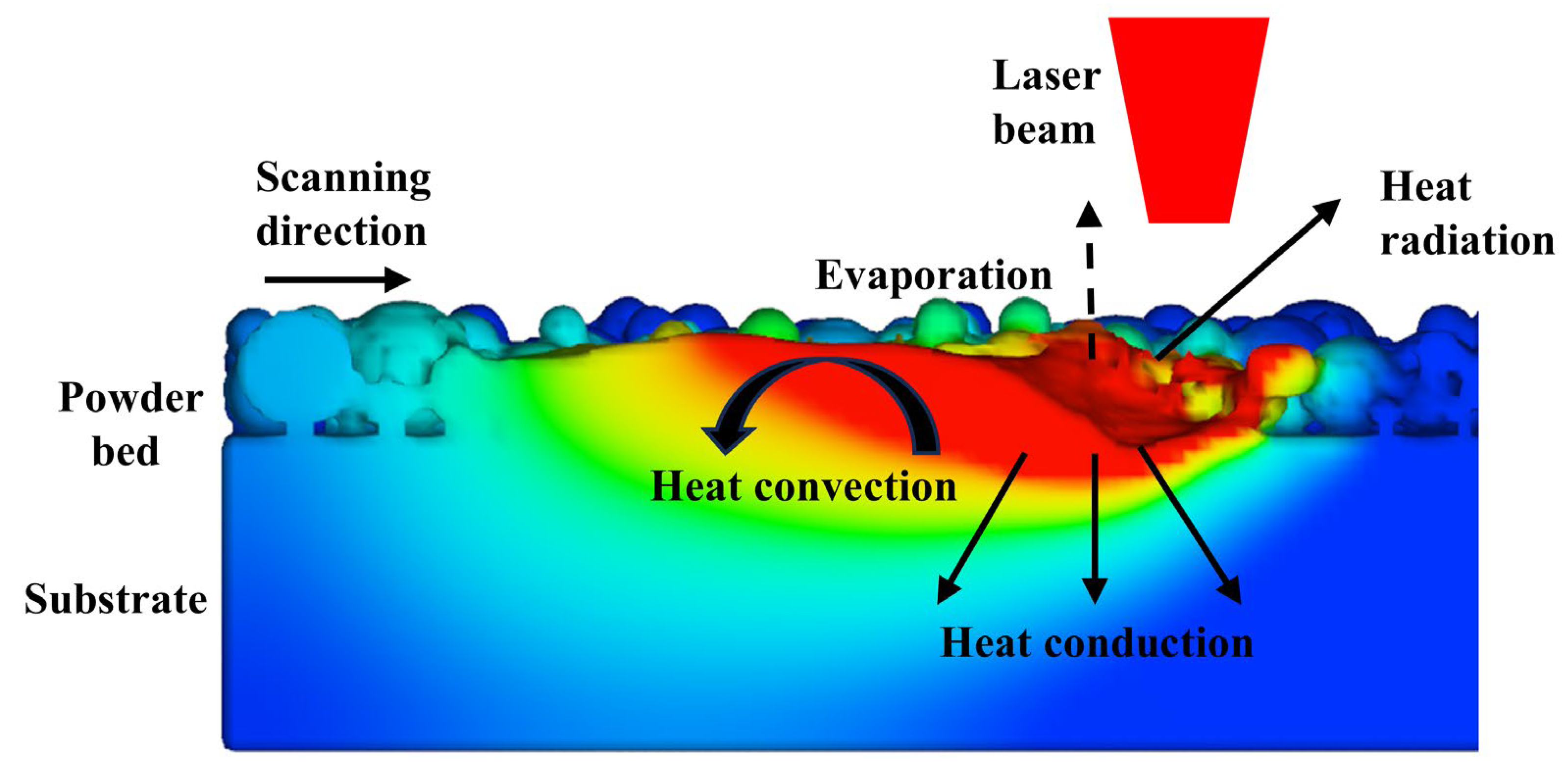 Figure 2. Schematic illustration of heat transfer mechanisms in the LPBF melt pool.