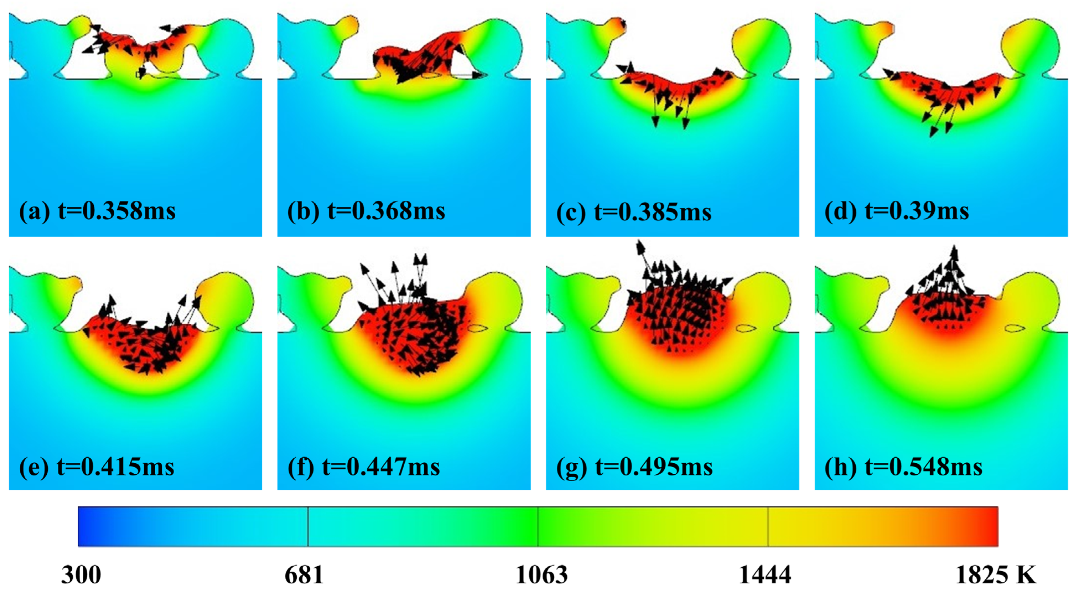 3.1. Melt Pool Flow Behavior and Temporal Evolution