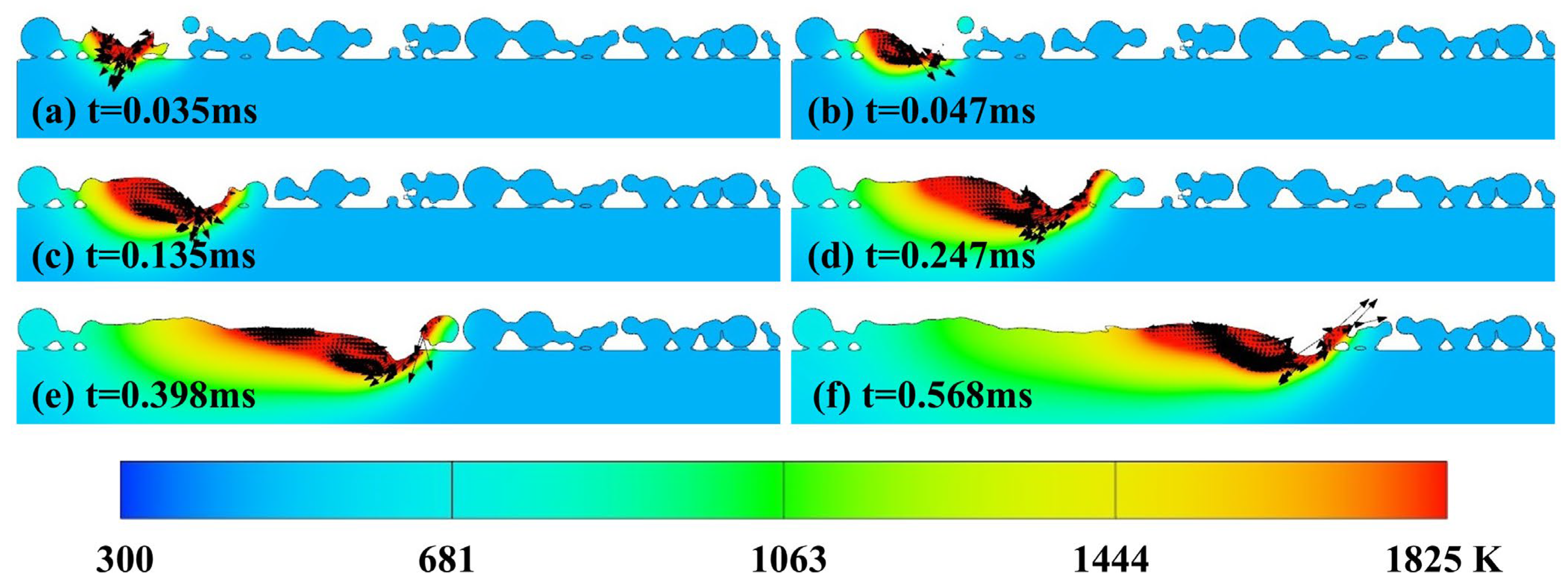 Figure 4. Temporal evolution of temperature and flow fields in the XZ cross-section of the melt pool at P = 90 W and v = 900 mm/s. Arrows indicate the direction of fluid flow.