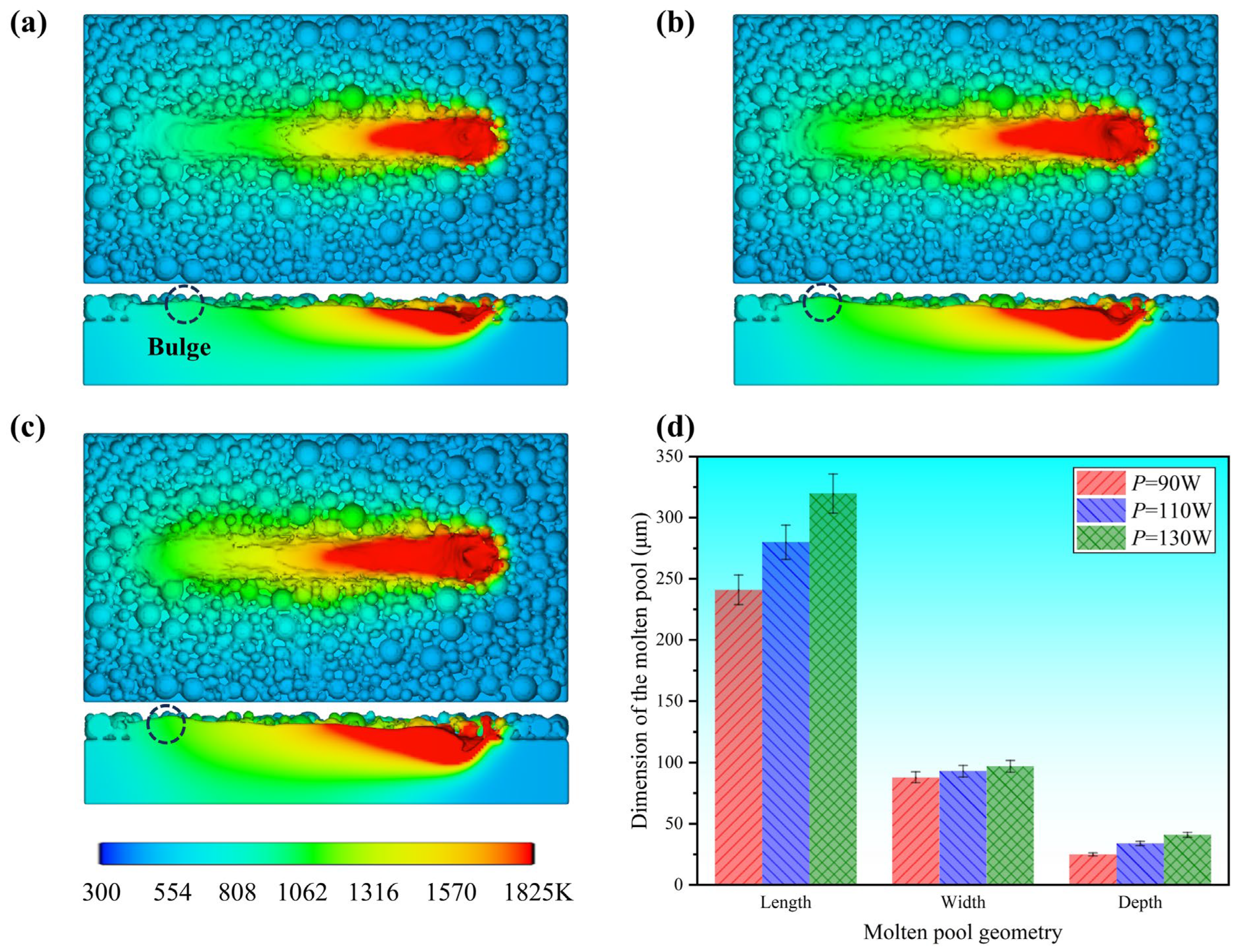 Figure 5. Top and cross-sectional views of the melt pool and statistical dimensions under different laser powers at v = 900 mm/s: (a) P = 90 W, (b) P = 110 W, (c) P = 130 W and (d) comparison of melt pool length, width, and depth. The dashed circle indicates the bulge region of the melt track.