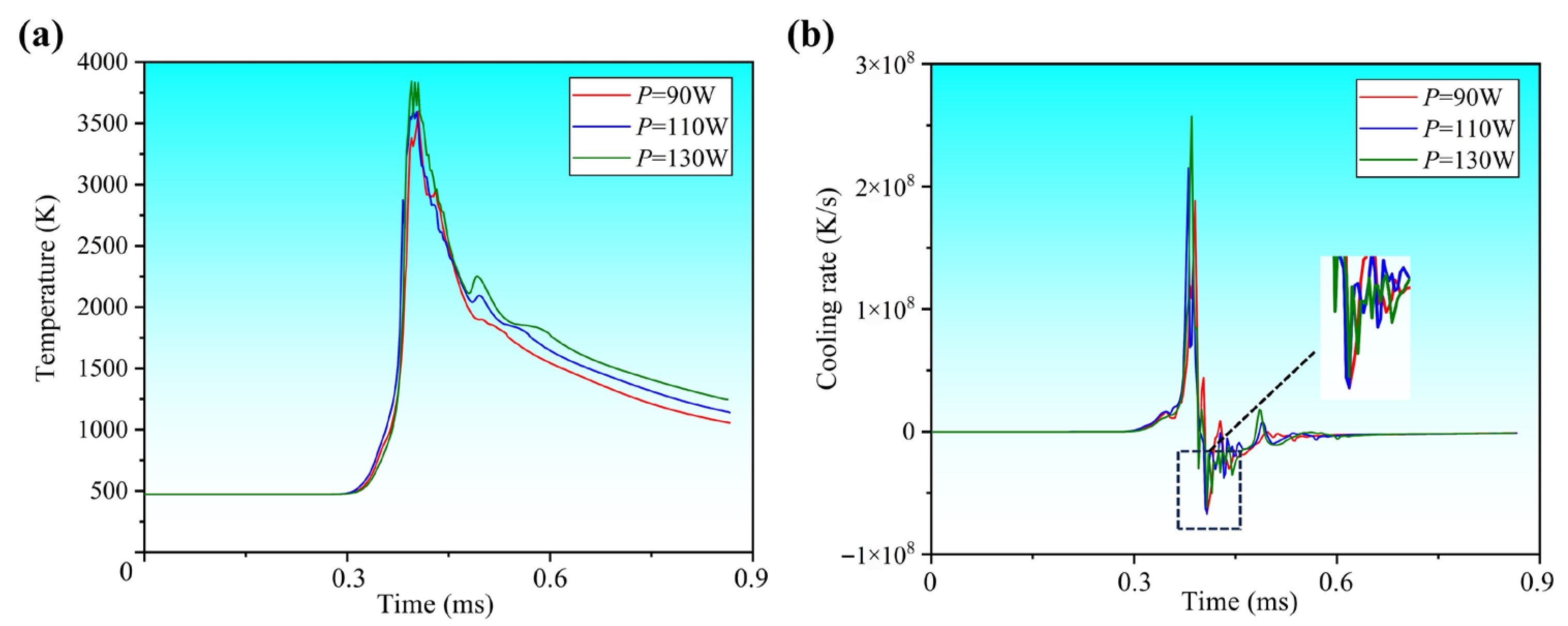 Figure 6. Thermal history and cooling rate of melt pool nodes under different laser powers at v = 900 mm/s: (a) thermal history of the nodes, (b) cooling rate of the nodes.