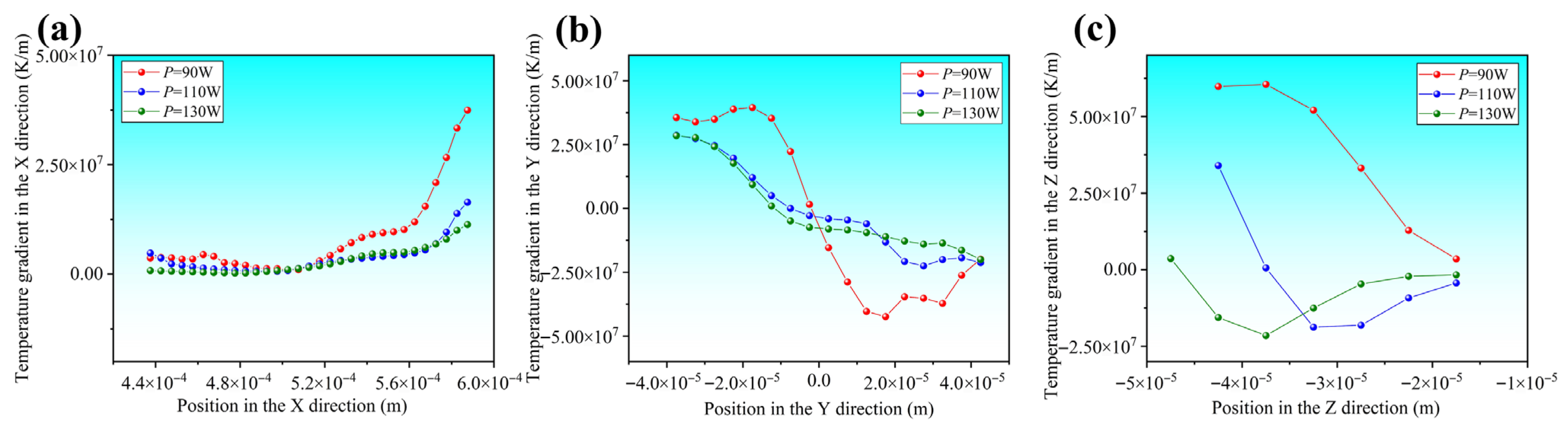 Figure 7. Temperature gradients of melt pool nodes under different laser powers at v = 900 mm/s: (a) X direction, (b) Y direction, (c) Z direction.
