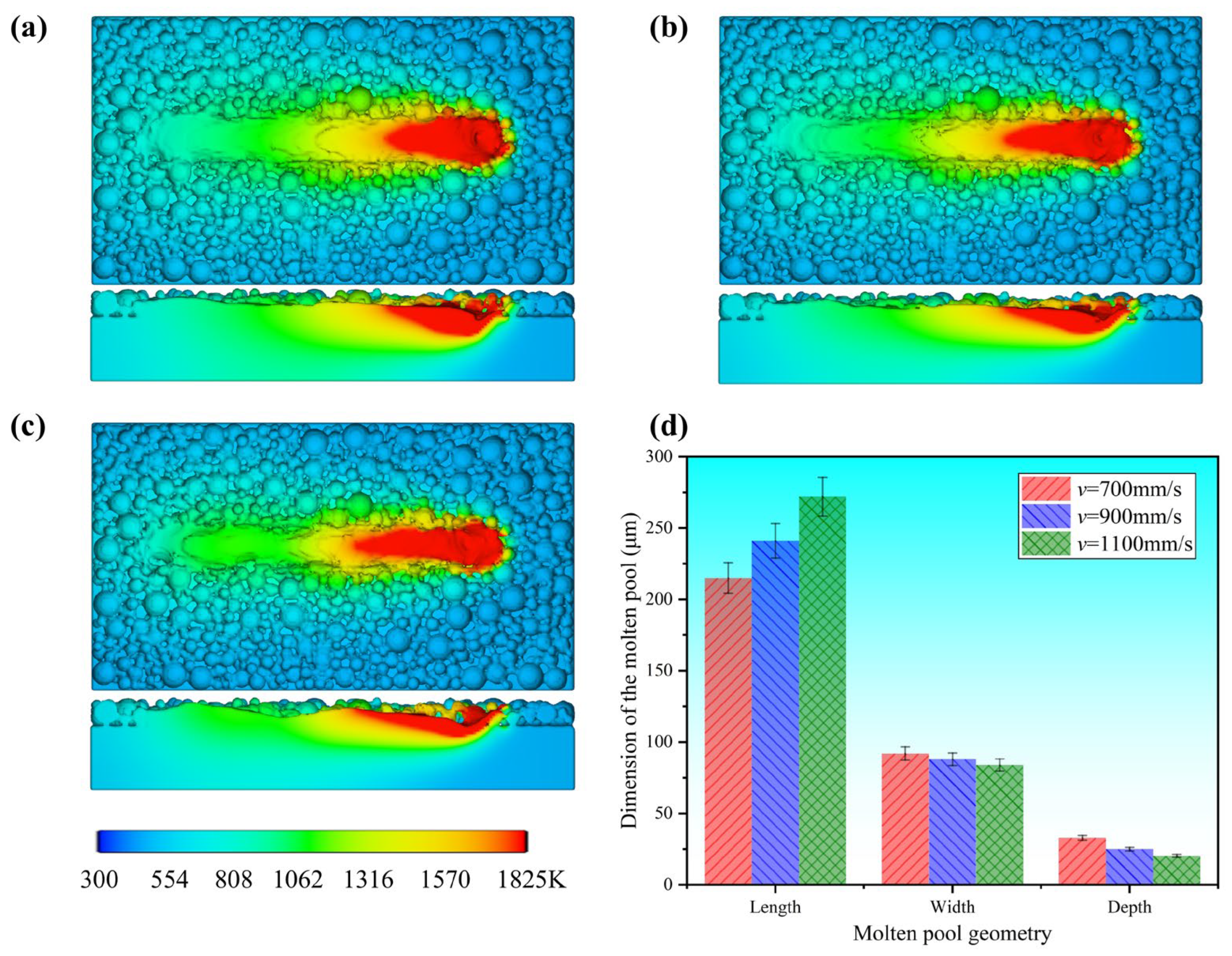 Similarly to laser power, scanning speed also plays a decisive role in shaping the melt pool morphology. Figure 8 illustrates the top view, longitudinal cross-section, and the comparative dimensions (length, width, and depth) of the melt pool at P = 90 W under different scanning speeds. The melt track surface still exhibits wave-like ripples as well as slight bulging at the initial stage of the track. With increasing scanning speed, the interaction time between the laser and the material becomes shorter, which reduces the heat input per unit length and consequently decreases the melt pool width and depth. Compared with the low-speed case (v = 700 mm/s), the melt pool width and depth at v = 1100 mm/s decrease by about 8.7% and 38%, respectively. In contrast, the melt pool length increases as scanning speed rises, with the trailing length reaching up to 272 µm. This occurs because the laser source advances more rapidly at higher speeds, while the solidification of the melt pool tail is constrained by heat conduction and latent heat release, preventing it from keeping pace with the moving heat source. As a result, the melt pool is elongated in the scanning direction, forming a pronounced “tailing” effect.