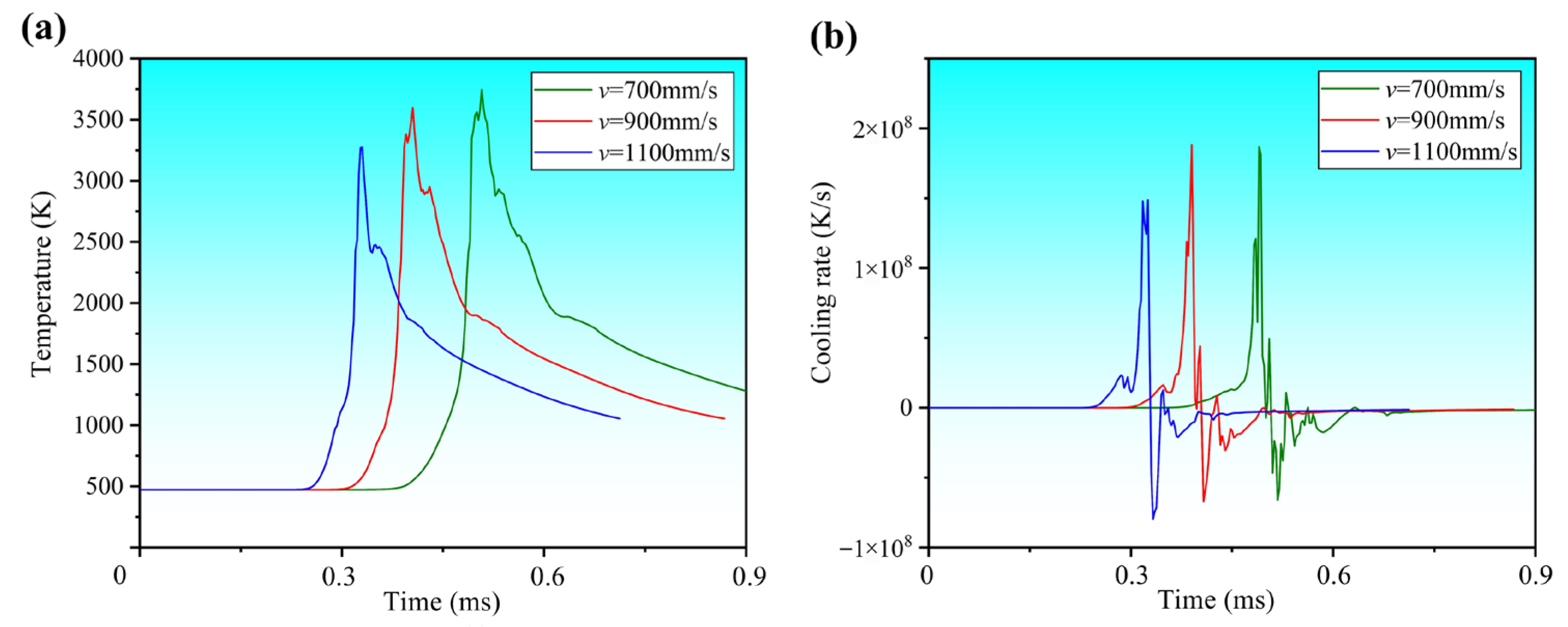 Figure 9. Thermal history and cooling rate of an internal node in the melt pool at P = 90 W under different scanning speeds: (a) thermal history, (b) cooling rate.