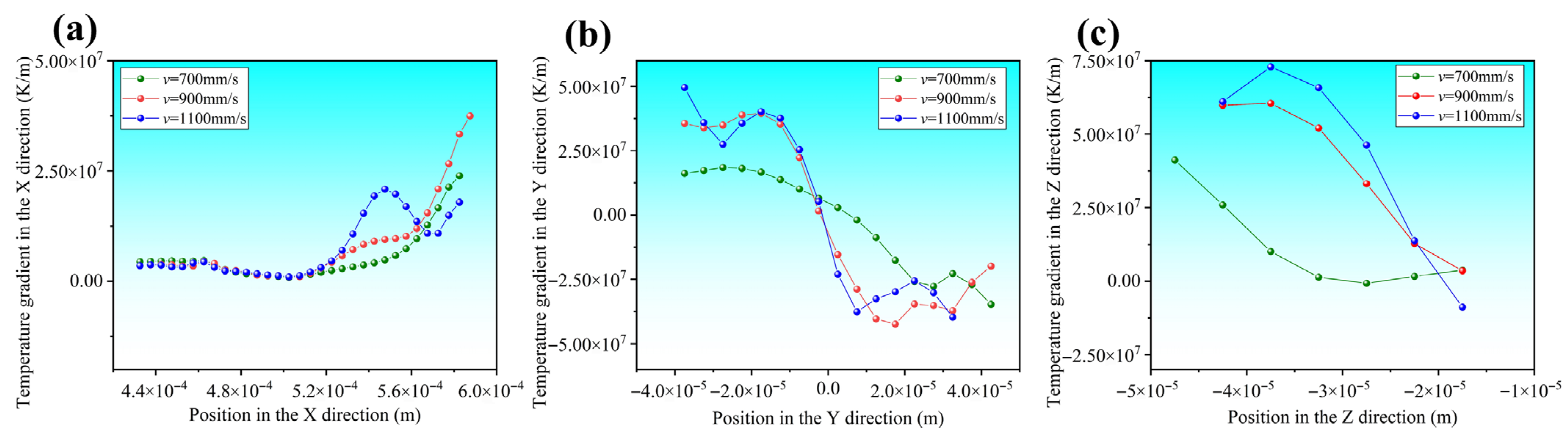 Figure 10. Temperature gradients of melt pool nodes at P = 90 W under different scanning speeds: (a) X direction, (b) Y direction, (c) Z direction.