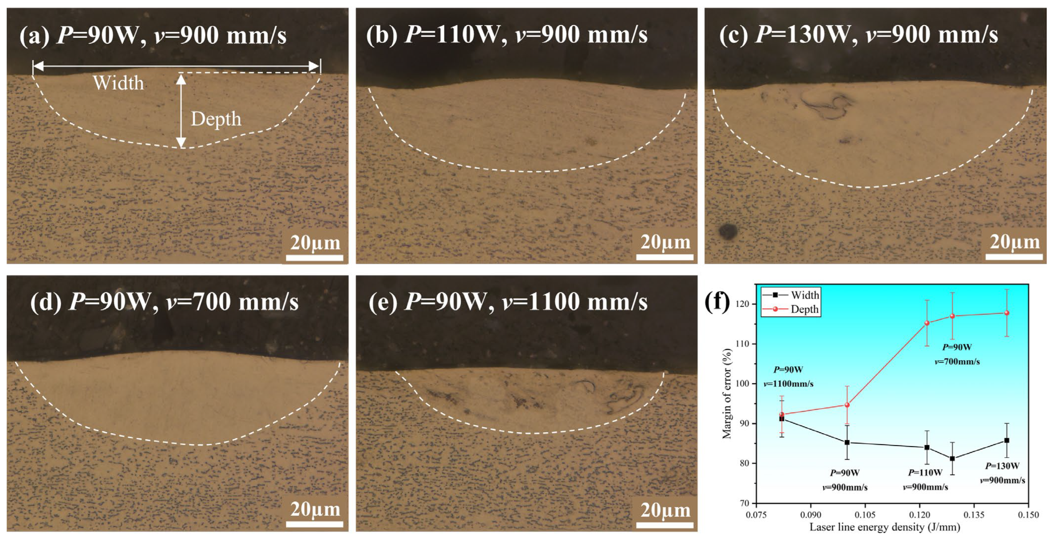 Figure 11. Cross-sectional morphology of single tracks under different process parameters and comparison with simulations: (a) P = 90 W, v = 900 mm/s; (b) P = 110 W, v = 900 mm/s; (c) P = 130 W, v = 900 mm/s; (d) P = 90 W, v = 700 mm/s; (e) P = 90 W, v = 1100 mm/s; (f) comparison between experimental and simulated results.